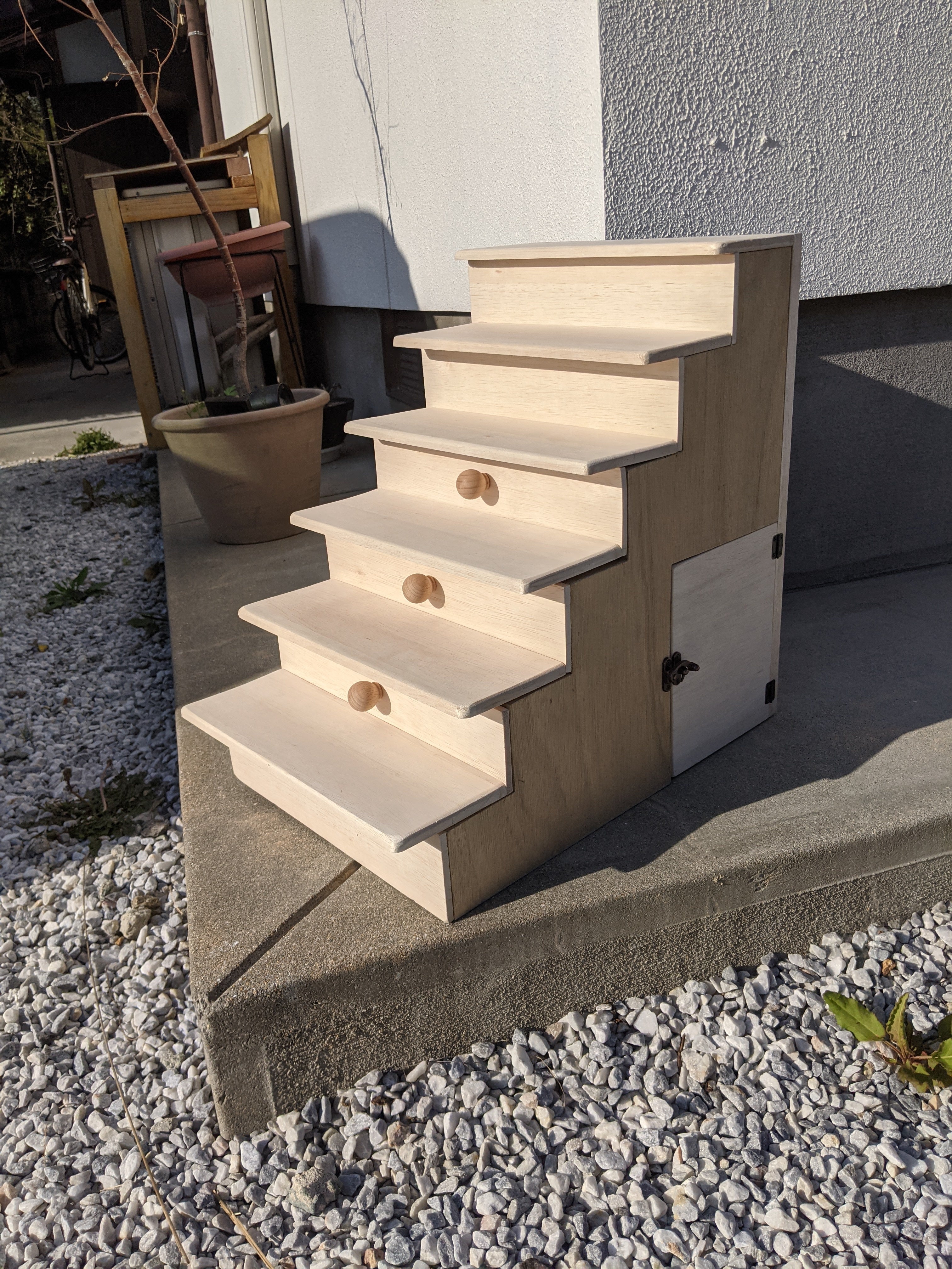 生後2ヶ月前後の仔猫達か先輩猫ちゃん達の真似をしているのを幾度となく見たのが作るきっかけで、最初はごく普通の階段でしたが、引出しタイプにすれば、付加価値が付きおやつ等を入れれ便利だなと思い、今の形になりました。