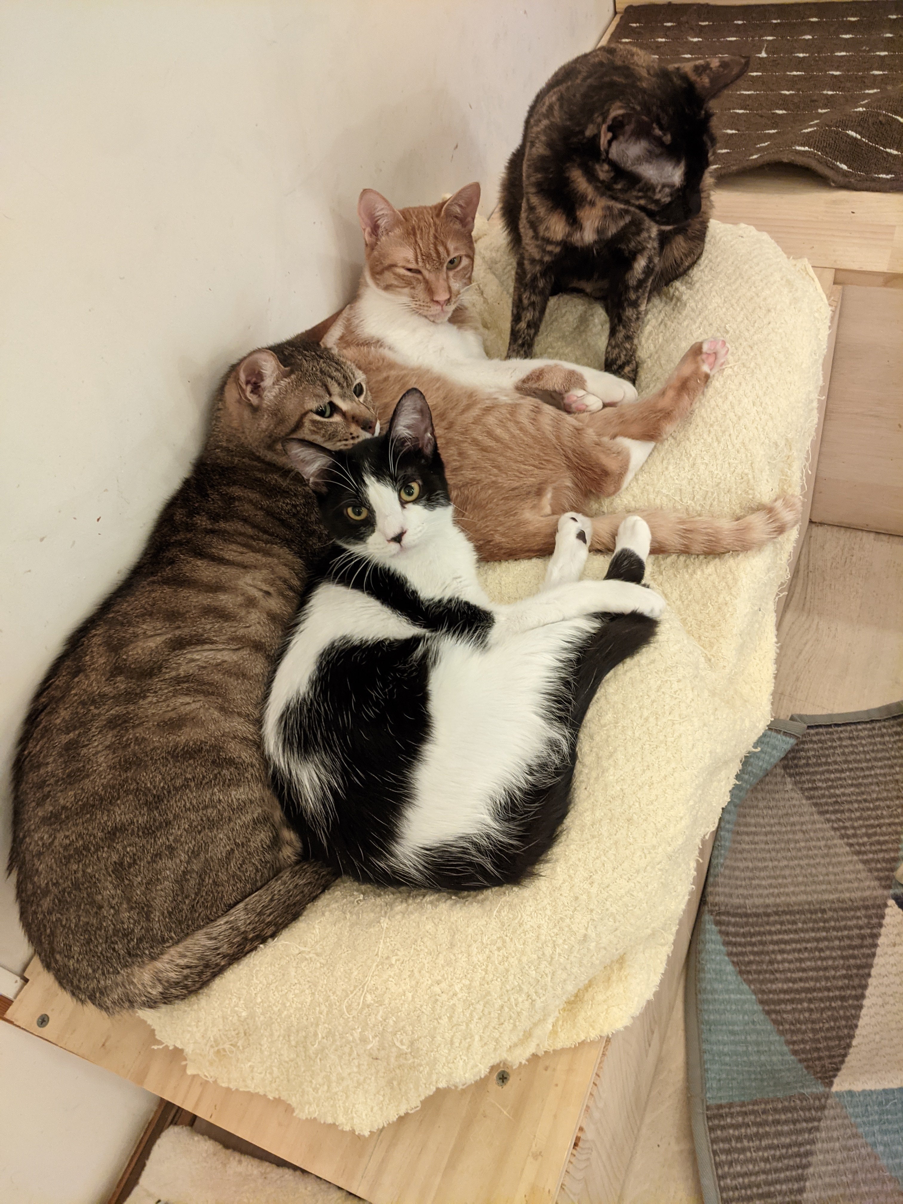 当店オリジナル ☆キャットタワー&猫ハウス☆昨年5月保護猫カフェOPEN当初、ごくごく普通の市販キャットタワーを使用していました。毎日最低2回、多くて3〜4回のカフェ内清掃。特に季節の変わり目の抜毛‥‥特に時間を要する箇所は、猫ちゃんと一緒に暮らされている方と同じで、マットやキャットタワーです。抜毛が絡みつき、なかなか取れない!それが毎日‥‥ある日、妻から「キャットタワー作って〜」「はい、作ります」から製作開始!Google検索、You Tube等を見たのですがどれも全て平面タワー‥‥小スペースで壁2面を活かしたキャットタワーを作りたい!と思い、元々、市販キャットタワーが置いてあった場所に‥‥試行錯誤!キャットタワーと言えば天空猫ハウス!※天井はそんなに高くありません!天空猫ハウスと言えば肉球!そんなこんなで、どうにかオリジナルキャットタワー&猫ハウスが完成!清掃も短時間で済み、場所も小スペース何より、猫カフェの子供たちが楽しそう!‥‥申し分無し!妻の一言が無ければ、このキャットタワーや猫ハウスは作っていません。ネット販売では、安定して売れています。画像キャプションキャットウォーク、キャットタワー、猫ハウスなど、作ってみて猫カフェに取付け子供たちの反応を見てからの値販売です。他県の猫カフェにも取付けでもらっています。多くの愛猫家さんの猫ちゃんに、格安でクォリティーの高い物を使って貰いたい一心で毎日作っています。‥‥これからも!今日はずっと雨だったので、片道40分の田川店へ行き製作しました。※製作で余った廃材を利用し肉球ポストも作ってみました。‥‥少し納得がいきませんが!☆猫家具・遊具の販売収益は全て保護猫達に使用しています。