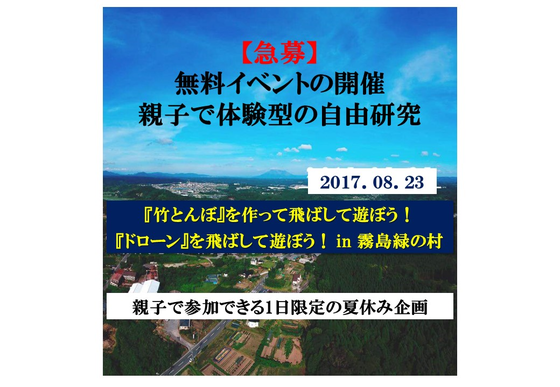 2017/08/24 21:57「竹とんぼ」や「ドローン」を飛ばして遊ぼう in 霧島緑の村 皆様方からの心温まるご支援をいただき、本当にありがとうございました。 夏休みですが平日での開催!当初20名位を予定していましたが、総勢約50名(参加者40名・スタッフ10名)満面の笑みが咲き誇るとても楽しいイベント、ケガや事故なども無く、イベントを無事に開催することができました。 数ある写真のなかより、数枚写真を掲載致します。是非、ご覧ください。 ■子供たち、保護者、地域の方々、みんなで竹とんぼ作りスタート ■さぁ、飛ばしてみよう~ ■初めてのドローン(トイドローン)飛行体験 ■みんなで記念撮影 はーい!ドローンを見てね!はいチーズ! とても楽しい夏休みの体験型の自由研究となりました。 もっと見る最後の追い込み中