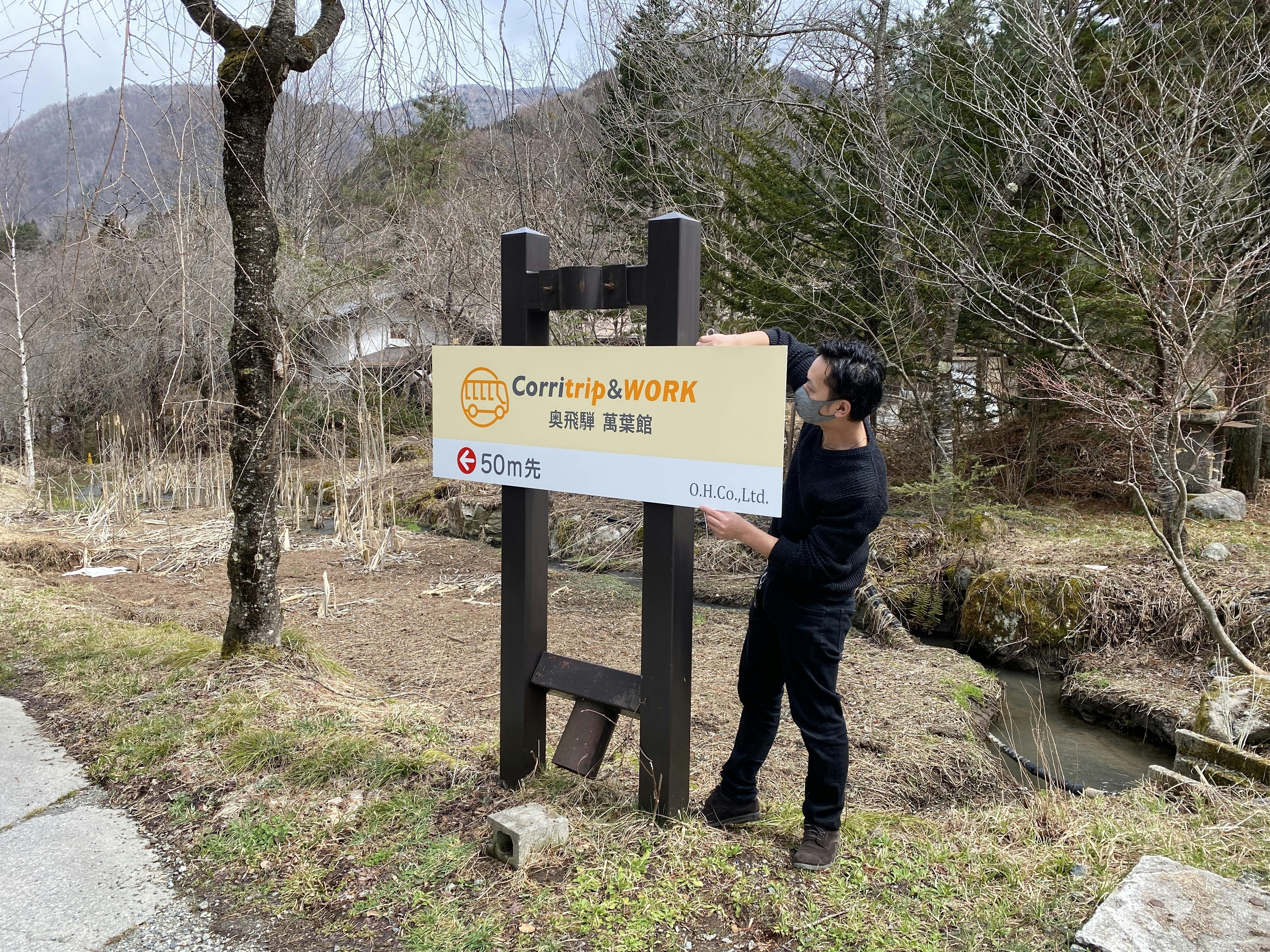 そこで、ワーケーション施設の場所を少しでも見つけやすくしようと、『Corritrip &WORK 奥飛騨 萬葉館』の看板を作りました!!
