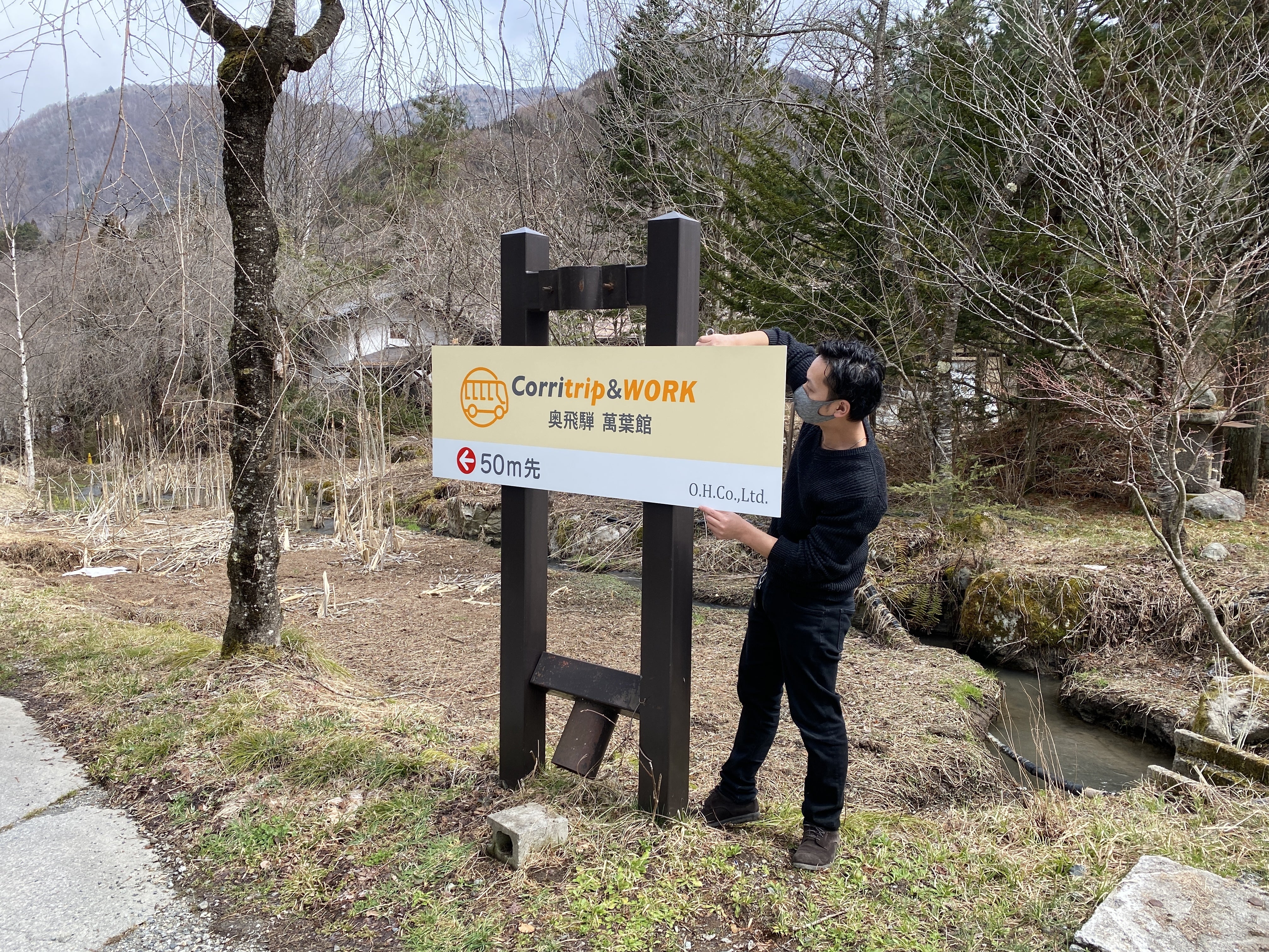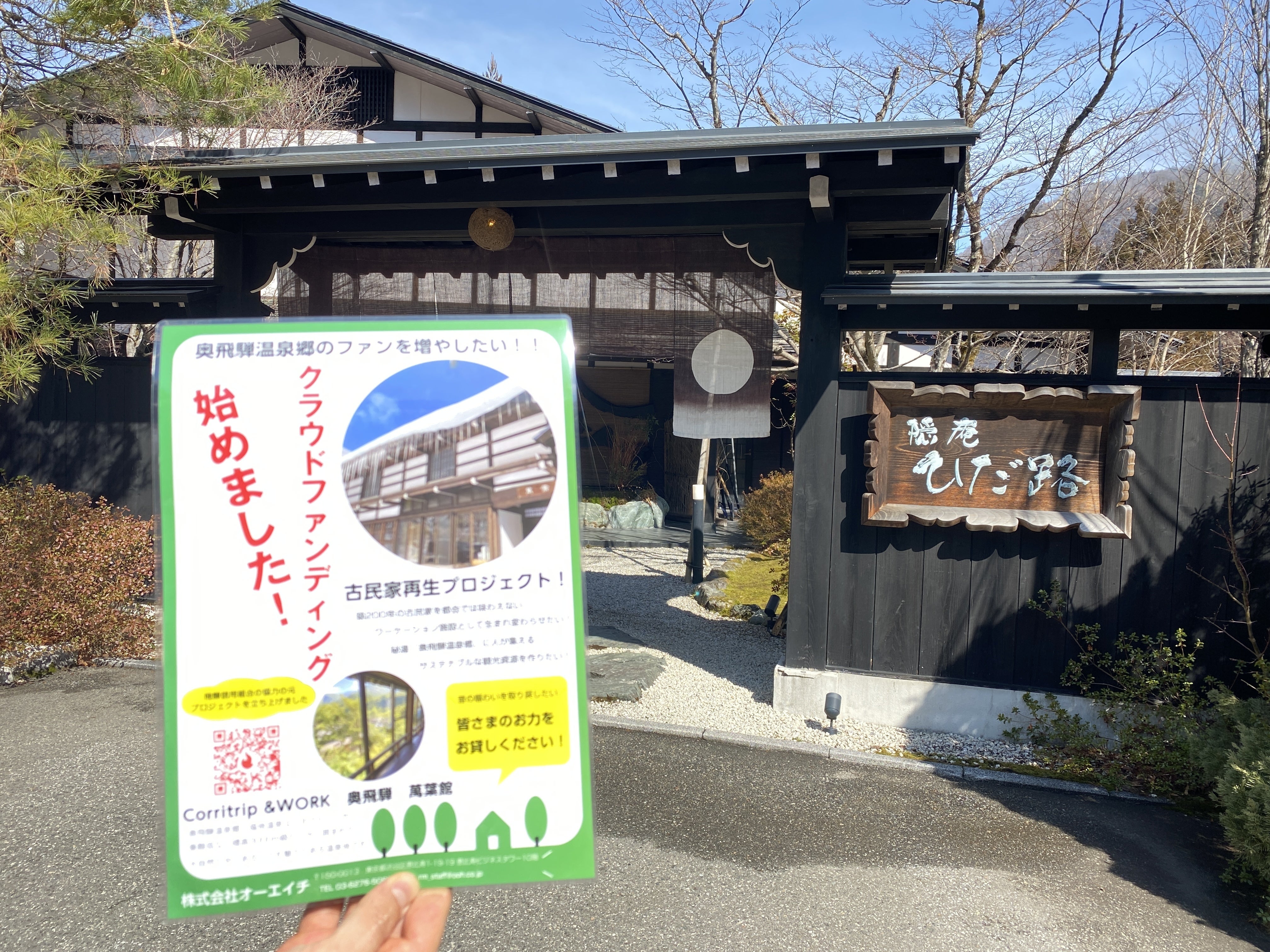 こんにちは!本プロジェクトメンバーの杉山と申します。日頃よりクラウドファンディングのご支援そして温かい応援メッセージをありがとうございます。今日は、私どもが待ちに待った看板設置のご報告です!さて、古民家再生プロジェクトを始め、少しづつ認知され始めたワーケーションスタンド『Corritrip &WORK 奥飛騨 萬葉館』ですが、場所がわかりにくいといったコメントをよくいただいておりました。そこで、ワーケーション施設の場所を少しでも見つけやすくしようと、『Corritrip &WORK 奥飛騨 萬葉館』の看板を作りました!!メイン通りからもわかりやすい場所に設置しております。これできっと迷わずお越しいただけるかと思います。いよいよクラウドファンディングのプロジェクトも折り返し地点となりました!ご協力いただいている皆さまと一緒にメンバー一同最後まで走り切りたいと思っておりますので、最後までご支援のほど、どうぞよろしくお願いいたします。