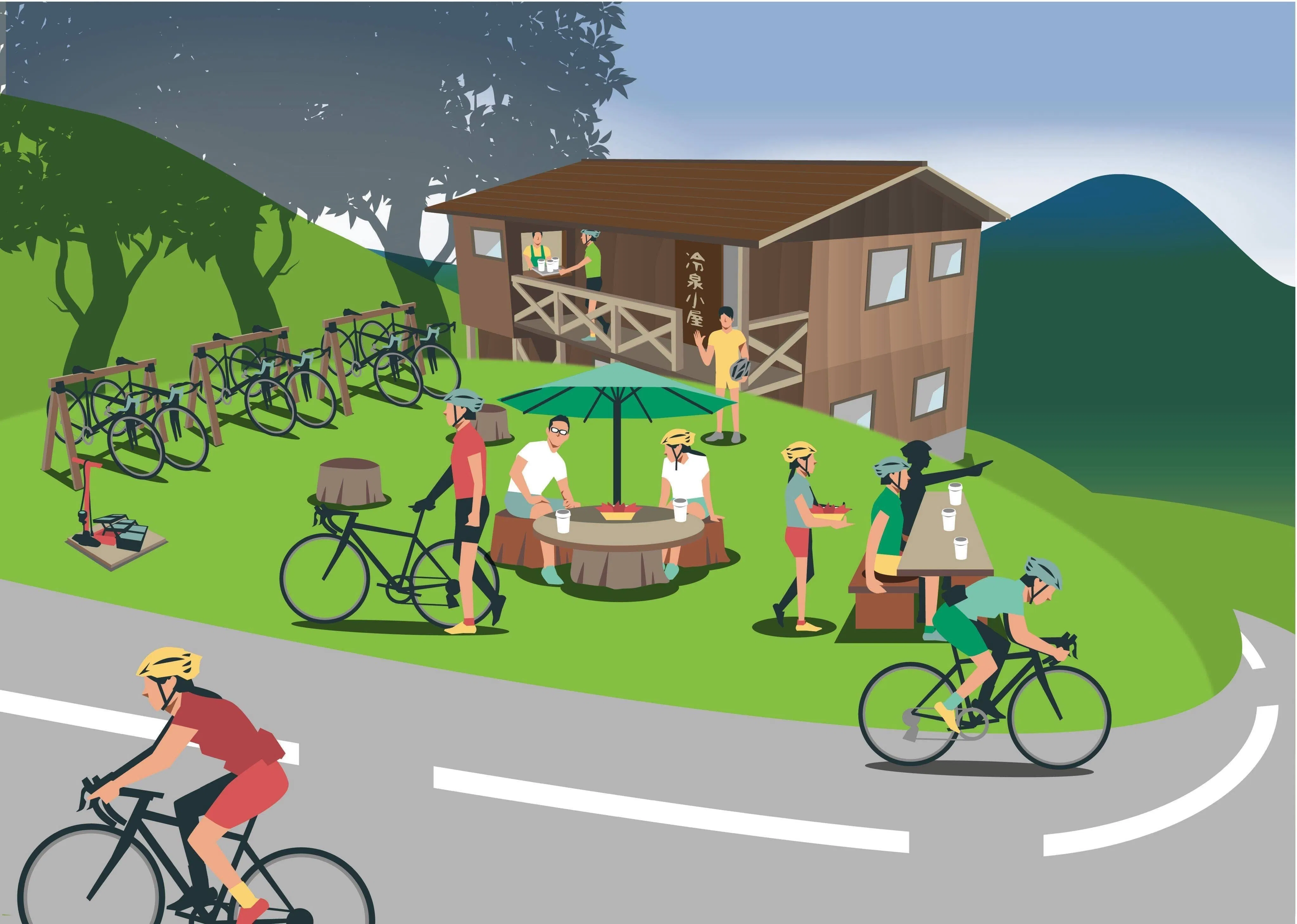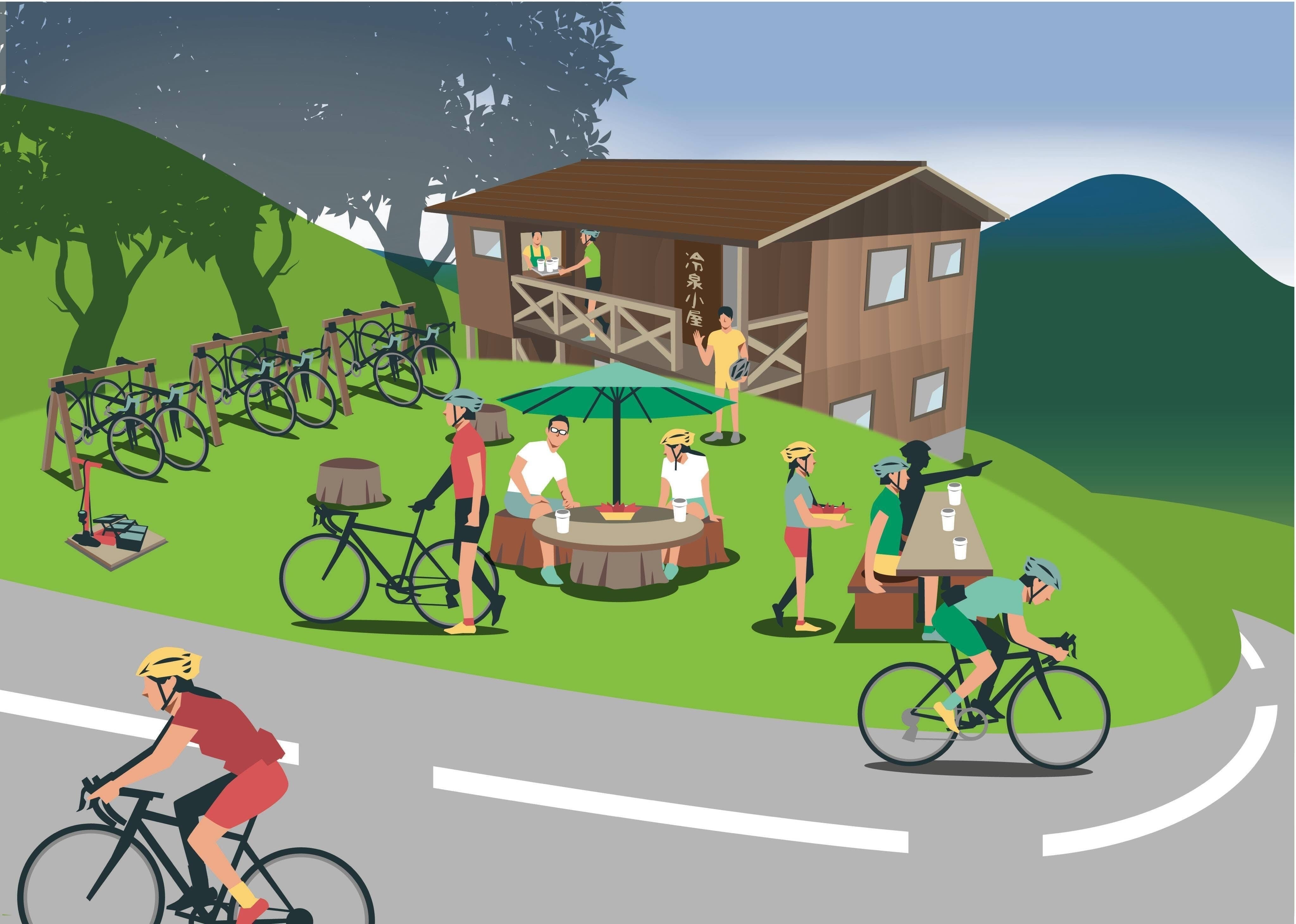 気軽に立ち寄ってもらって休憩し、カフェや軽食を楽しんでもらえる場所にします。加えて、サイクリスト向けの補給食販売やドリンクのサービスはじめ、e-Bikeの充電ポートの設置。さらに、パンクなどメカトラブルに対応できるだけのメンテナンス工具類も常設します。このほか、気軽に休憩できるようにバイクラックを設置し、愛車を眺めながら美味しい珈琲を楽しみつつ、サイクリスト同士の交流が盛んになるような空間づくりを実現します。