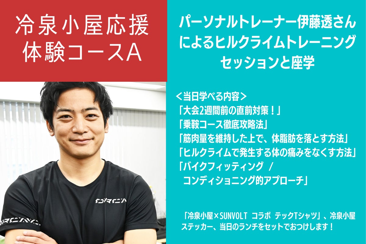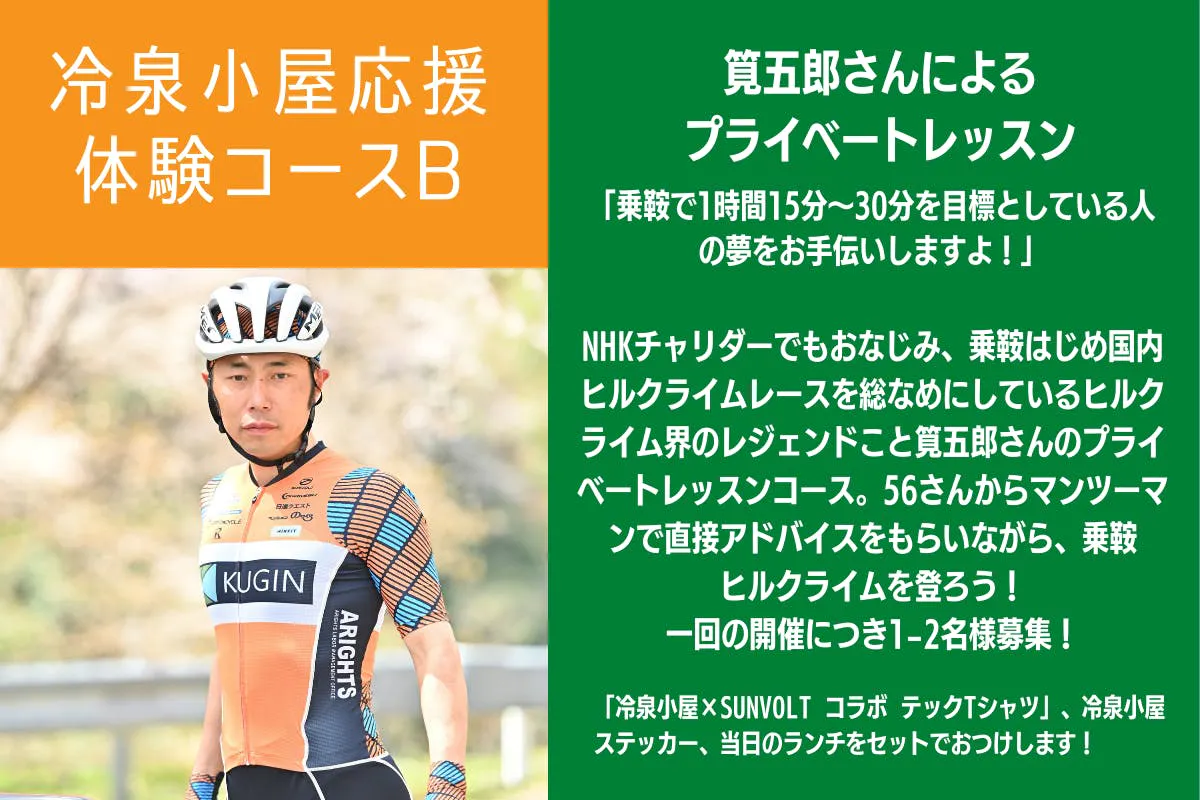 さらに、「冷泉小屋×SUNVOLT コラボ テックTシャツ」、当日のランチ、冷泉小屋ステッカーもセットになったお得な内容。
