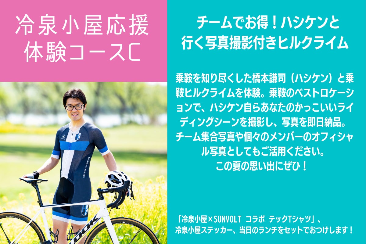 乗鞍を知り尽くしたサイクルジャーナリスト兼フォトグラファーの橋本謙司(ハシケン)と乗鞍ヒルクライムを体験。乗鞍のベストロケーションで、ハシケン自らあなたのかっこいいライディングシーンを撮影し、写真を即日納品。チーム集合写真や個々のメンバーのオフィシャル写真としてもご活用ください。この夏の思い出にぜひ! さらに、「冷泉小屋×SUNVOLT コラボ テックTシャツ」、当日のランチ、冷泉小屋ステッカーもセットでお渡し。