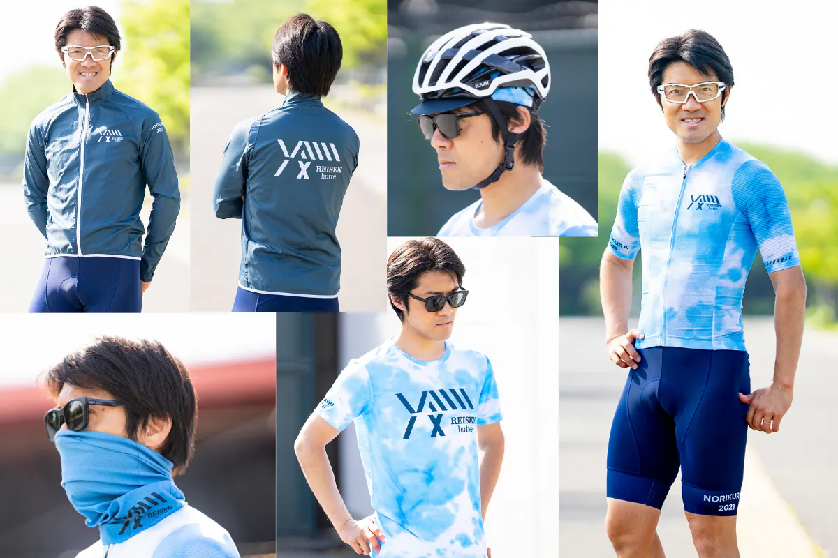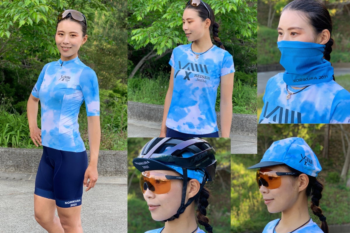 冷泉小屋の冷泉をイメージさせる水色のタイダイ柄。サイクルキャップやジャージ、テックTシャツ、Tシャツなどに使用しました。その他ネックゲイター、ビブパンツ・ウィンドブレーカーなどサイクリストのみなさんに役立ち、且つ、街でも使えるオシャレなデザインをご用意いたしました。