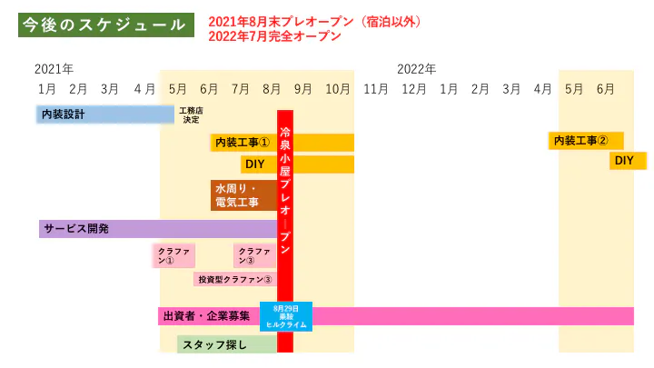 今後は、本クラウドファンディングも含め資金調達をしていきながら、自己資金も足してプロジェクトを具体化していきます。5月のエコーライン開通のタイミングで内装工事・インフラ整備を順次していきます。