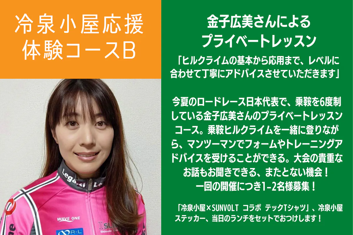 東京2020オリンピックのロードレース日本代表で乗鞍を6度制している金子広美さんと、NHKチャリダーでもおなじみ、乗鞍はじめ国内ヒルクライムレースを総なめにしているヒルクライム界のレジェンドこと筧五郎さんのプライベートレッスンコース。当初は1名での参加としておりましたが、2名様まで参加可能となりました!お友達と!ご夫婦で!どうぞ!