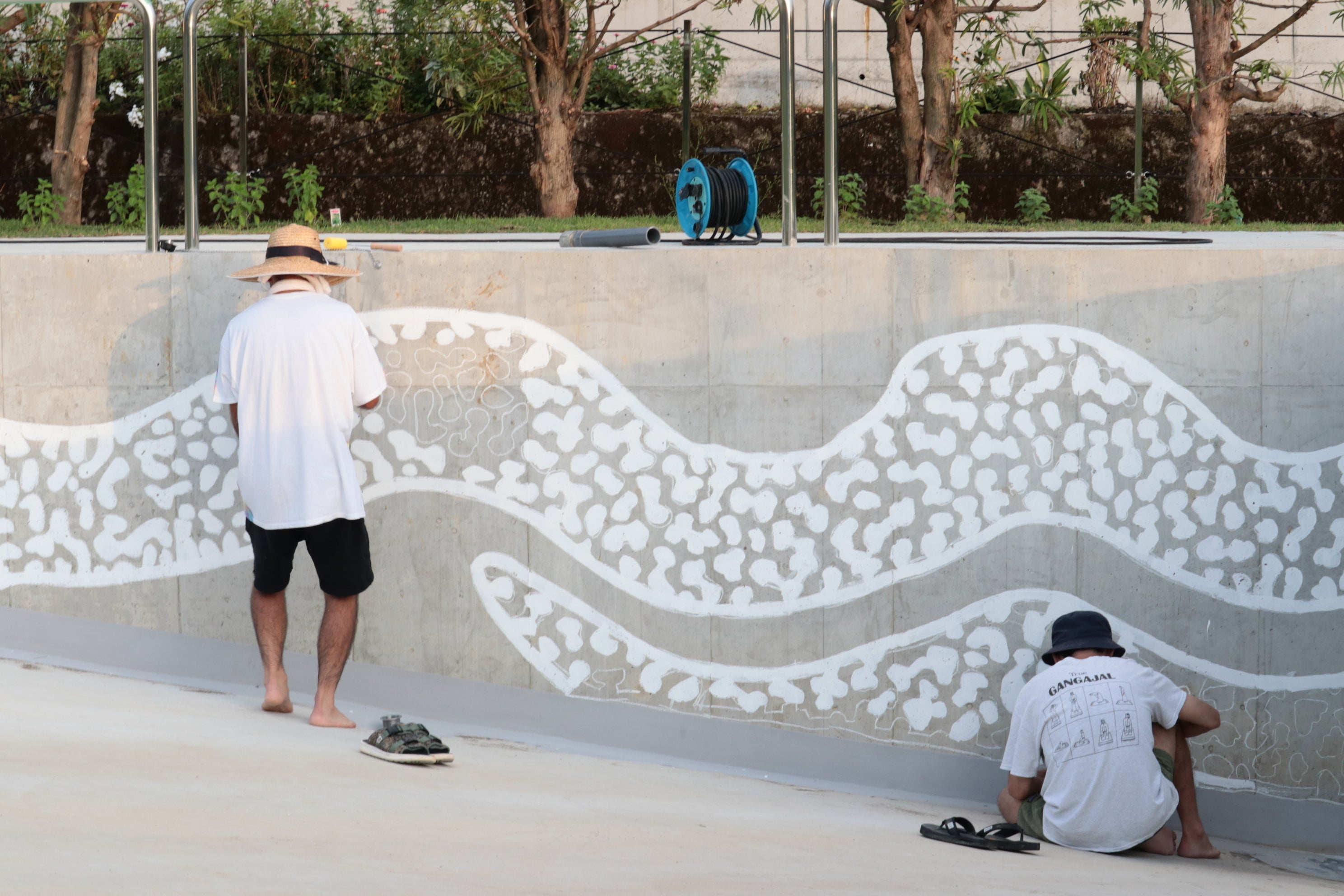 「やきものビーチ」 の壁に絵を描く竹内俊太郎さんの様子です。