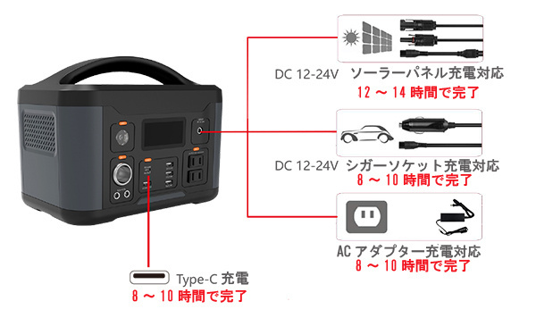 仮に500Wのソーラーパネル使用した場合は「500W×転換率20%=100W」となりますがIP28では70Wの充電となりますのでご注意下さい。