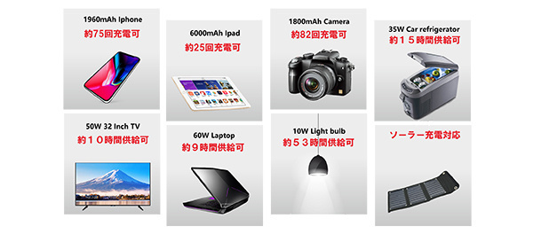 ・小型冷蔵庫 約15時間使用可能(約35W出力の小型冷蔵庫)