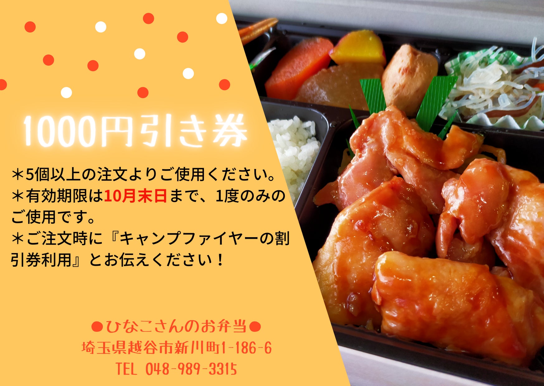 各ご支援に対し1枚・3枚・5枚と送らさせて頂きますので、是非ひなこさんのお弁当をこの機会にご利用ください!