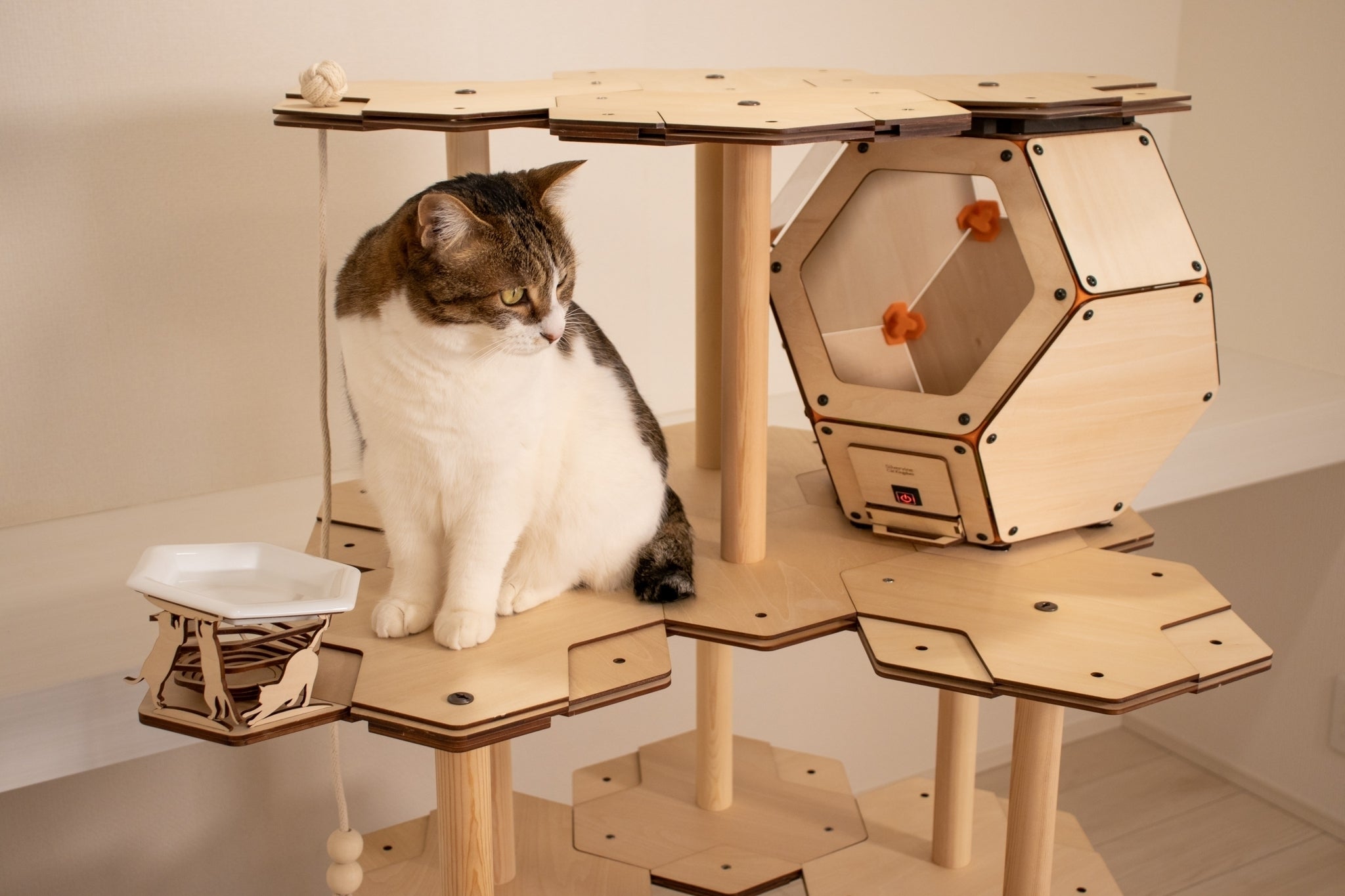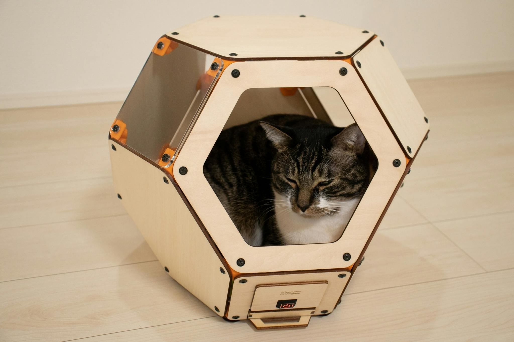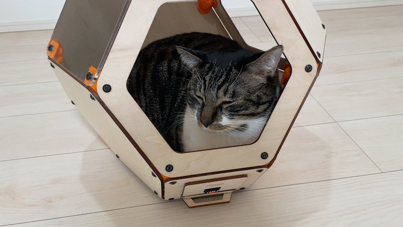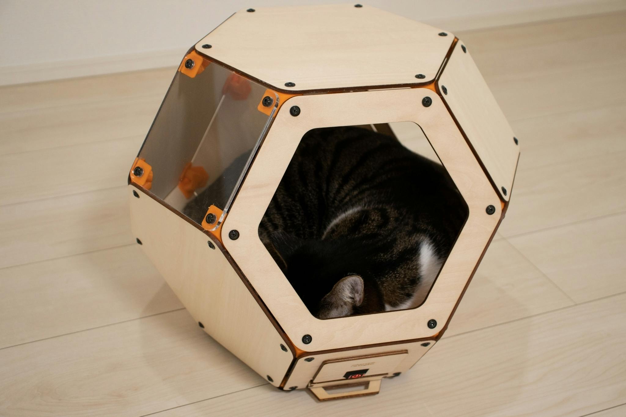 そこから、猫さんが登りたくなるキャットタワーを作れないか考え、タワーの高い所に、おもちゃや食事台を設置できるようにしました。そして昨年、猫さんは周りで何が起きているのかわかるけれど、きちんと自分のお部屋になっているアクリル窓付きの「にゃんこカプセル」を開発し、今回はその進化版となります。