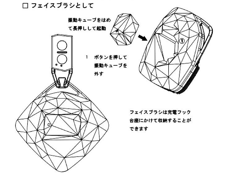 取り付けリング×2、振動キューブ×1、キューブ収納パーツ+フェイスブラシ×1、充電フック台座×1、micro USBケーブル×1