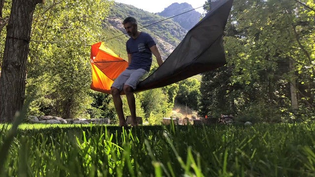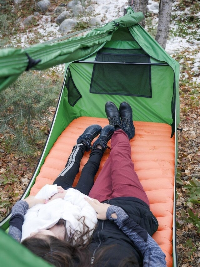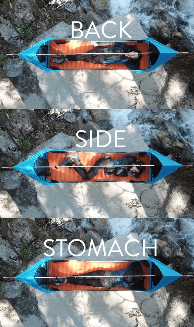 一般的なハンモックのように腰が沈まないので、身体に優しい設計です。