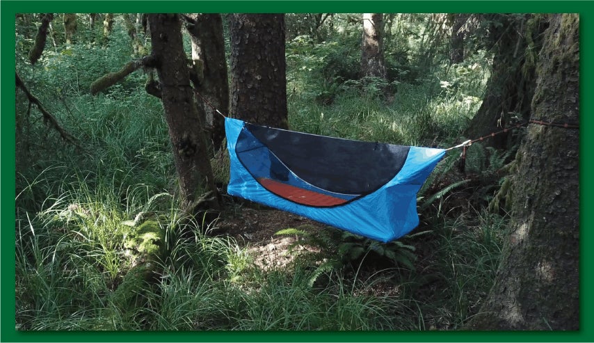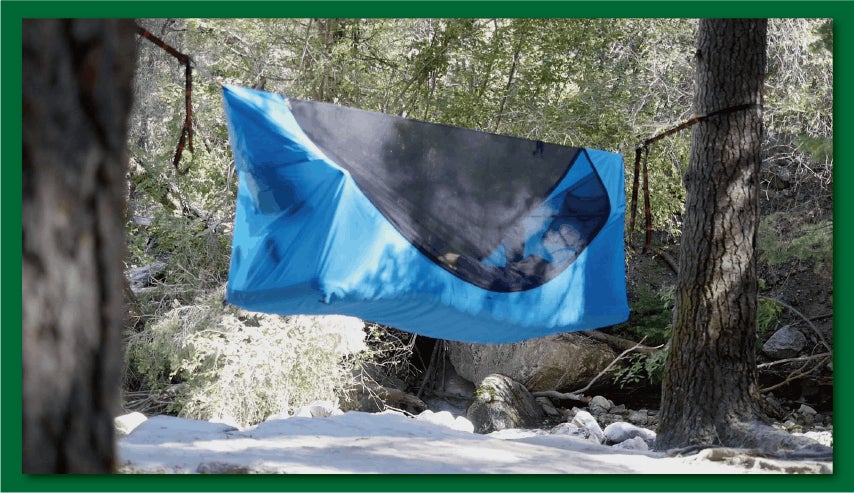 木がない場所でも簡易テントまたはビビィとして使用できます。設置用にペグ、ガイロープも付属。