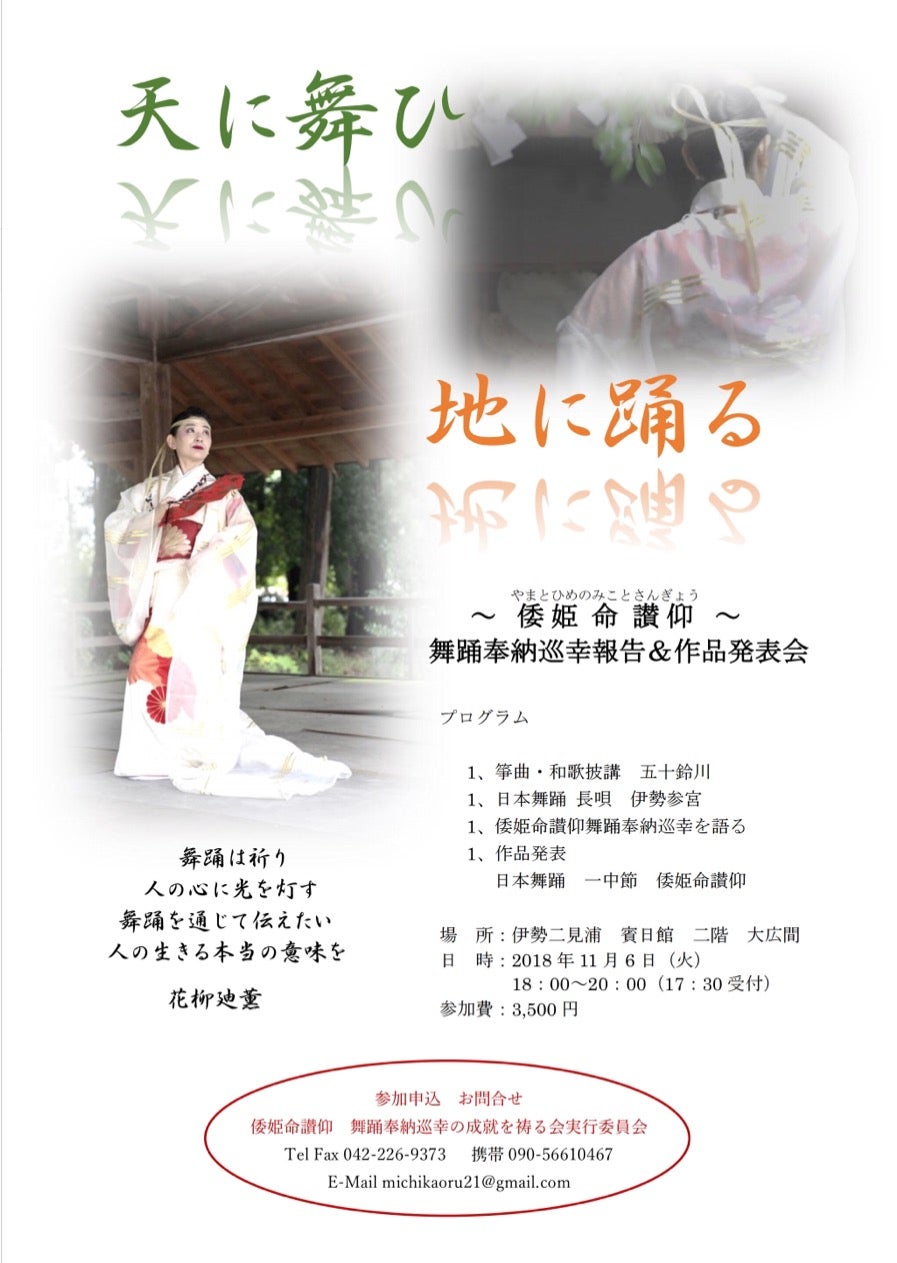 2018/10/04 09:4311月6日(火)18:00〜 伊勢二見浦 賓日館にて元伊勢27ヶ所を巡幸成就後の報告&作品発表会 いよいよ残すところ、後一ヶ月余り。準備期間も入れると2年越し、昨年の10月22日から舞踊奉納をスタートしたプロジェクトが11月6日を以って成就致します。 訳あって未だ公表できないことも有るのですが、不思議な必然が重なって、ここまで歩んで参りました。 運命は一瞬で変わる。でもそれは、そこまでの積み重ねの結果で有り同時に次への新たなる挑戦。 これが納まった後の自分が全く想像できません。 1人でも多くの方に見届けて頂きたいと思います。どうぞよろしくお願い致します。 100名様限定。参加ご希望の方は下記メールアドレスにメッセージをお願い致します致します。 同伴者を伴われる方は、人数とお名前をお知らせ下さいませ。 michikaoru21@dream.com 一中節「倭姫命讃仰」元伊勢にて奉納の際、奉納に相応しいと思われる部分のみを選び奉納致しましたが、この度は作曲者の都一中先生をお迎えして、初めて全曲を生演奏で披露させて頂きます。 お見届け頂けましたら幸いです。 神宮へ参宮された事の無い方は、これを機に是非お伊勢さんへお越し下さい。 〜天に舞ひ地に踊る〜倭姫命讃仰 舞踊奉納巡幸 報告&作品発表会 場 所:伊勢二見浦 賓日館 二階 大広間〒519-0609 三重県伊勢市二見町茶屋566−2JR参宮線 二見浦駅より 徒歩12分http://hinjitsukan.com/map.html日 時:2018年11月6日(火) 18:00~20:00(17:30受付)参加費:3,500円(100名様限定) プログラム 1、箏曲・和歌披講 五十鈴川 (宮城道雄:作曲) 箏 岡戸朋子 和歌披講 林 煌純 1、日本舞踊 長唄 伊勢参宮 立方 花柳廸薫 1、倭姫命讃仰舞踊奉納巡幸を語る 花柳廸薫 日本舞踊家 谷分道長 元倭姫宮奉職 元神宮主事 作詞者 都 一中 一中節宗家十二世 作曲者 白山芳太郎 皇学館大学特別教授 神社史研究会会長 神崎宣武 旅の文化研究所所長 民俗学者 山口和也 写真家 1、作品発表 日本舞踊 一中節 倭姫命讃仰 立 方 花柳廸薫 浄瑠璃 都 了中 三味線 都 一中 もっと見る第八回 倭姫命讃仰 舞踊奉納巡幸(No.20〜No.22)ご報告