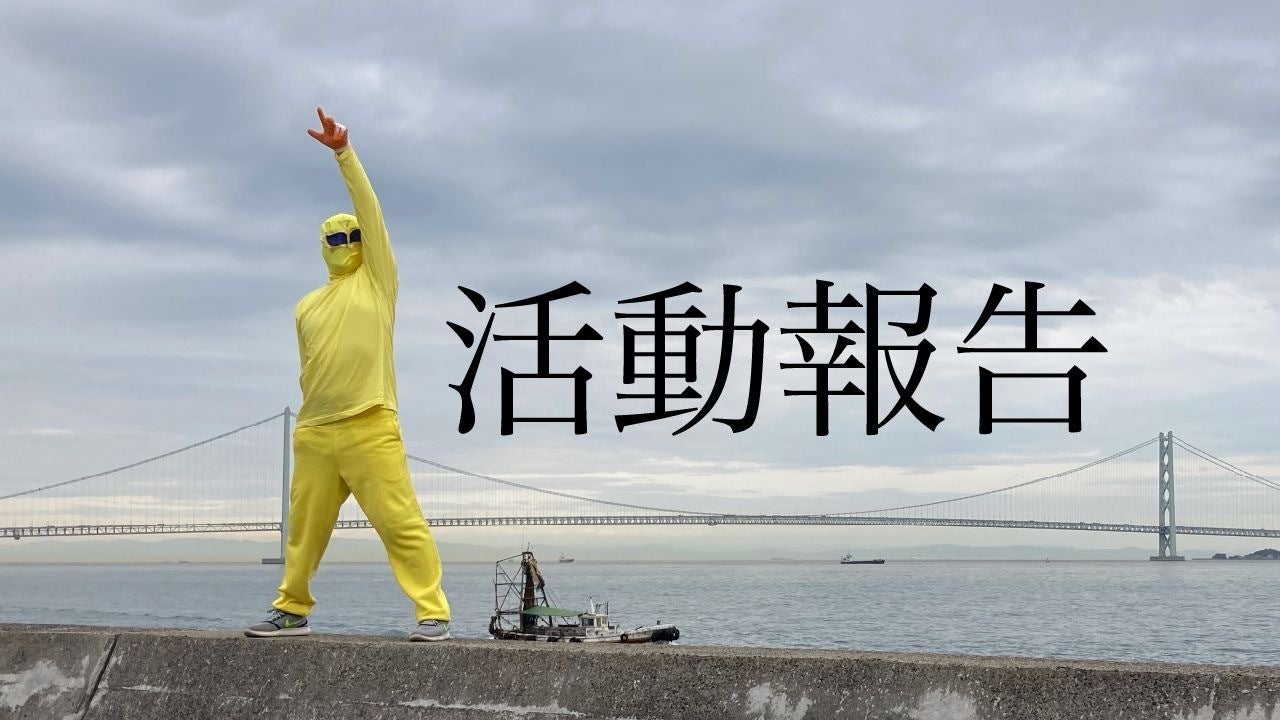 謎の黄色い人物のスクープ写真を手に入れたわ!この人、どうゆうつもりでポーズ決めてるのかしら?ってゆうか後ろに写ってるの明石海峡大橋じゃない…。