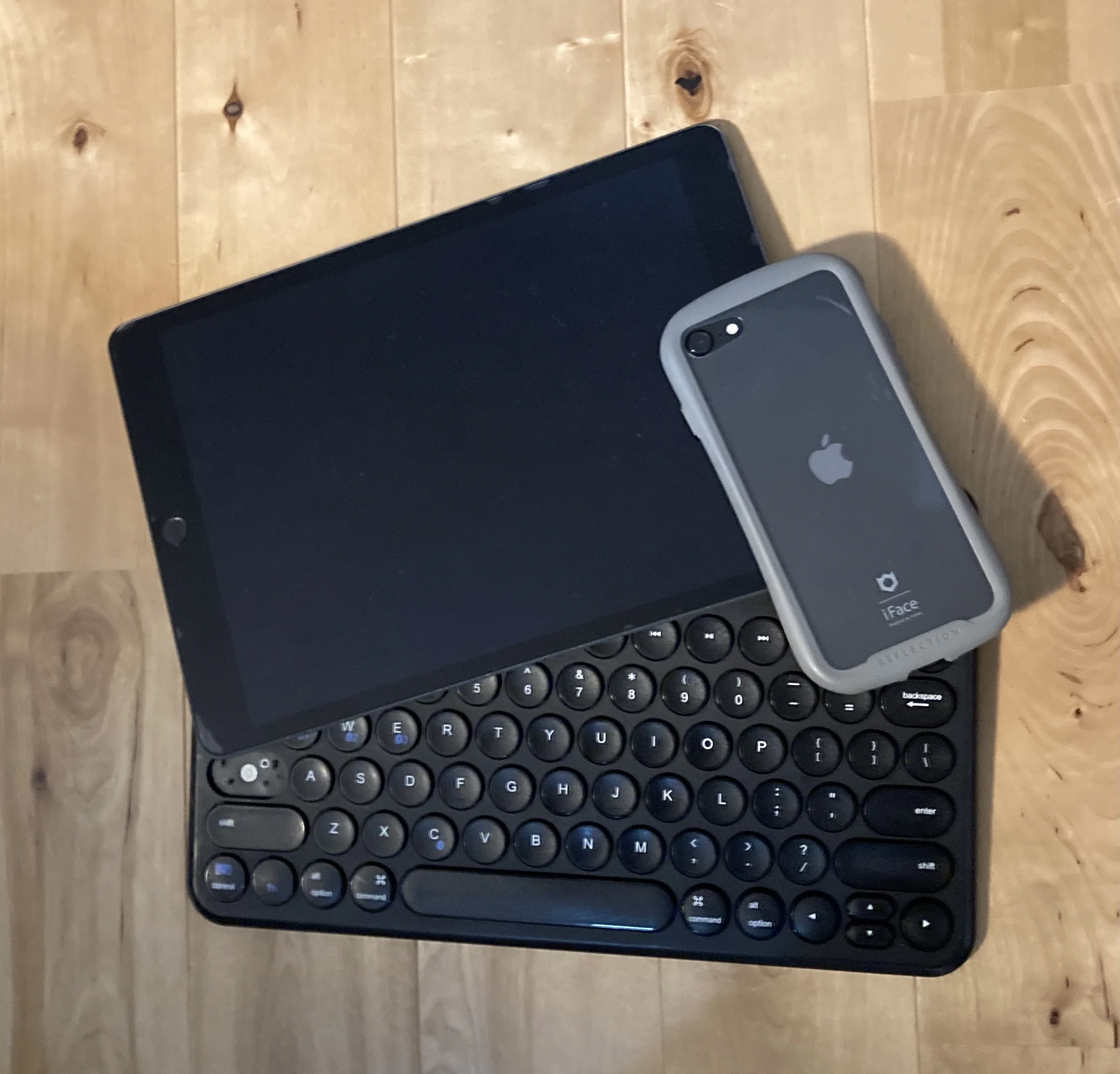 iPadとキーボードとiPhone se。
