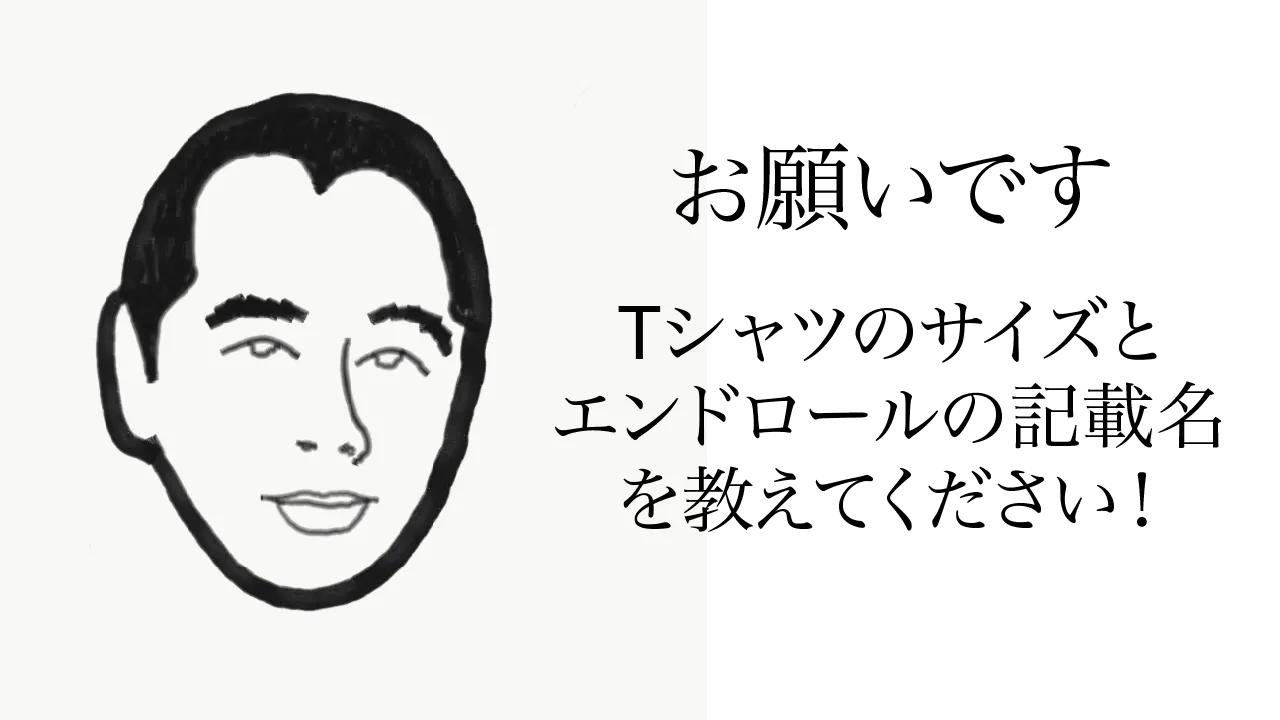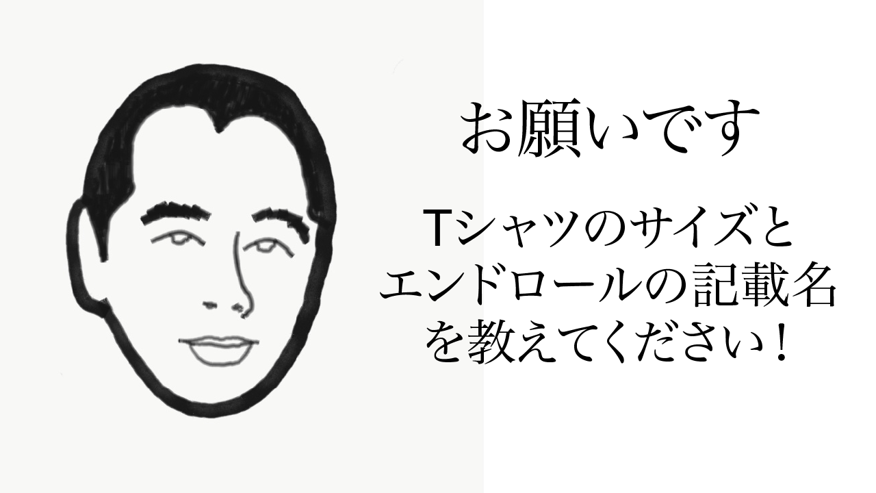 今日は、エンドロールとTシャツにご支援いただいた方にお願いがあります。ここ数日で、エンドロールで記載する名前、Tシャツのサイズの記入がなかった方に、私の代わりにマリアンダーがメッセージを送っております。お名前やサイズをご返信していただきますよう、お願いいたします。エンドロールには、平仮名、カタカナ、漢字、アルファベットいずれも記載いただけます。何卒よろしくお願いいたします。