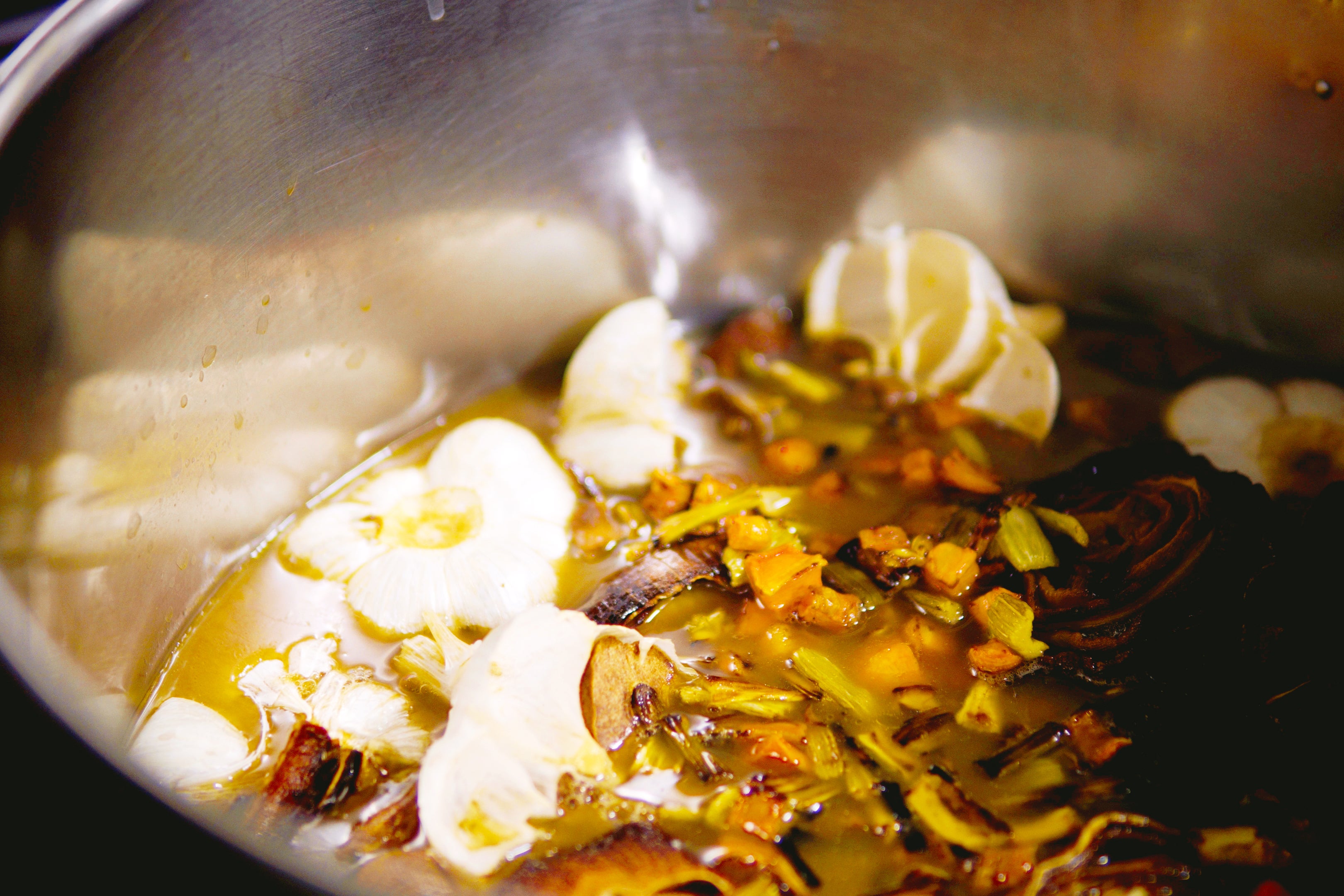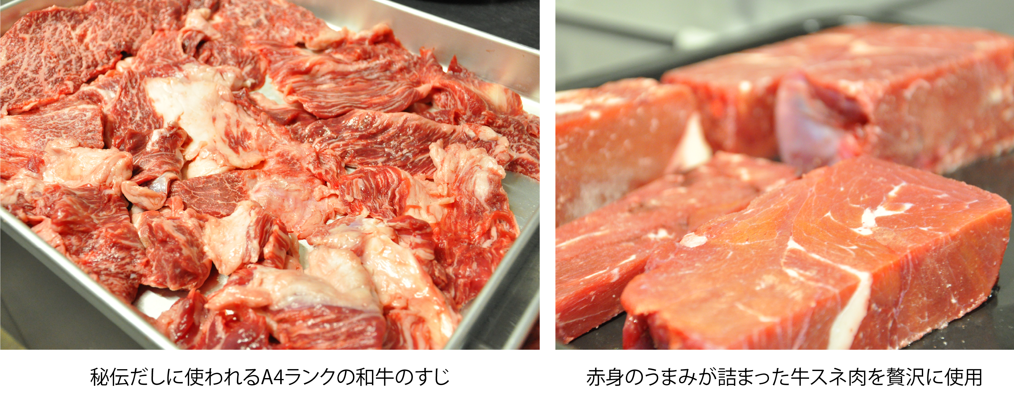 だしには A4ランクの和牛の筋をはじめ、錦爽どり(銘柄鶏)の鶏ガラ、仔牛の骨、三元豚の背骨、牛すね肉などの高級素材を惜しまずに使っています。