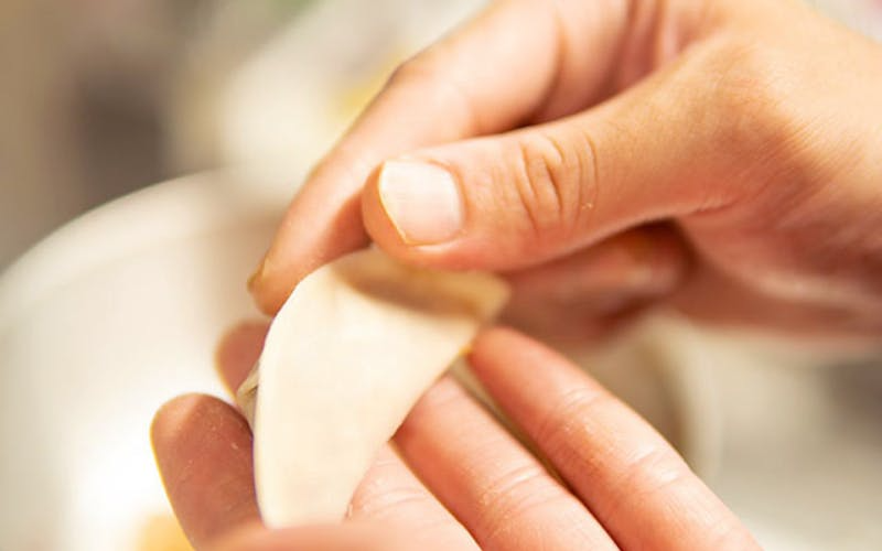 だし入り餃子餡の豊潤な旨味をダイレクトに感じる「うす皮」にこだわりました。中が透けるほどの 0.5mm皮は手慣れた職人でも苦戦するため、今では極わずかの店舗でしか扱っていません。