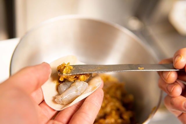 餡の野菜はキャベツがメインですが、ほんの少しだけ漬物にした白菜を組み合わせています。発酵の旨味を極少量加えることで奥行きのある味わいに仕上げています。