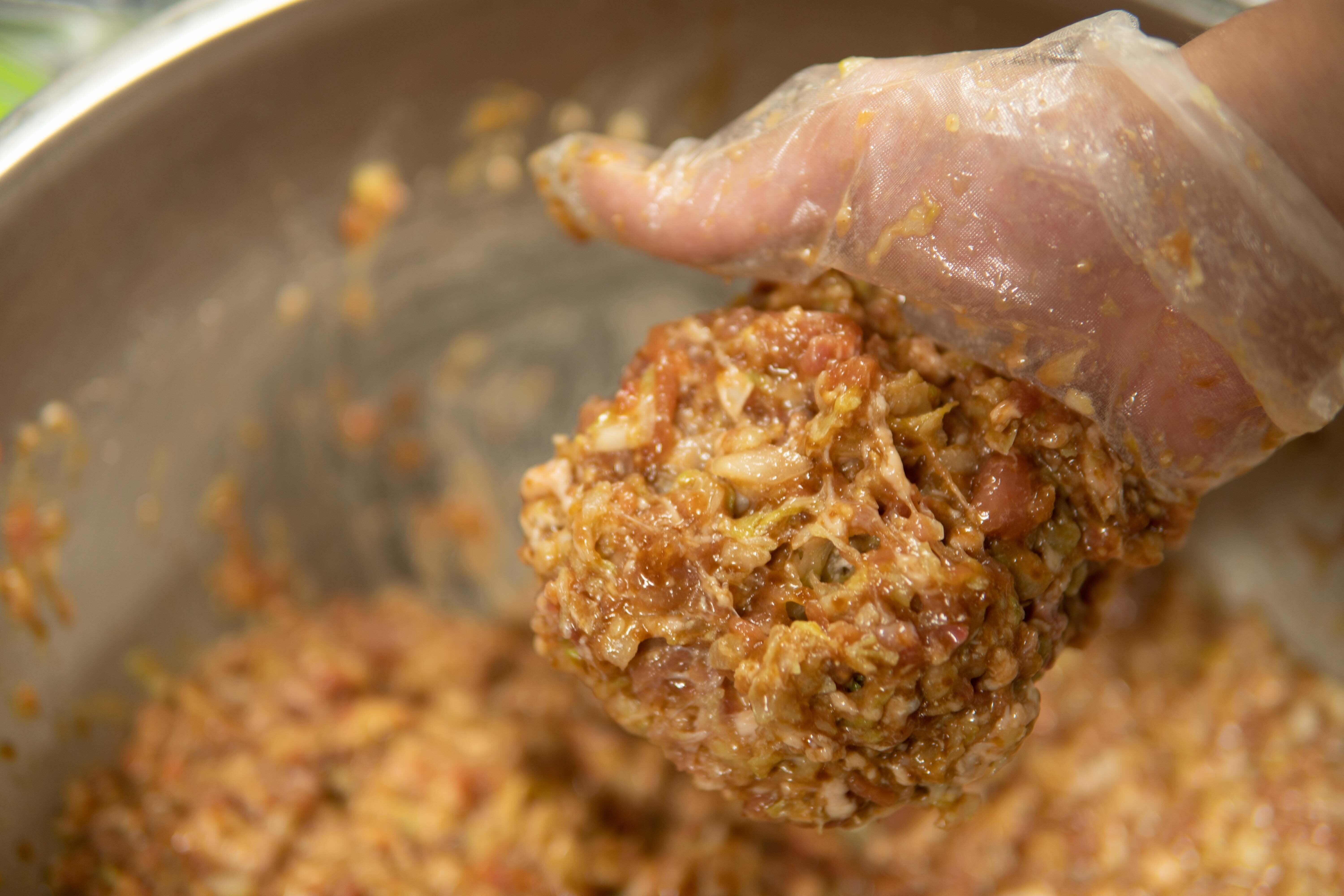 粗挽きミンチの食感を最大限に活かす肉の練り方を一年かけて研究しました。雪塩をまぶしてから数分置いて、だしを少量ずつ含ませながら叩き練ることで理想の味 ・ 食感を作りだします。