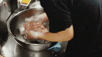 肉のメッカ 大阪 羽曳野市で 50年以上に渡り精肉業を営む「肉の匠 寺岡悟氏」に特別にお願いした粗挽きミンチを使用しています。試行錯誤を繰り返し、赤身の旨味が濃いウデ肉にたどり着きました。