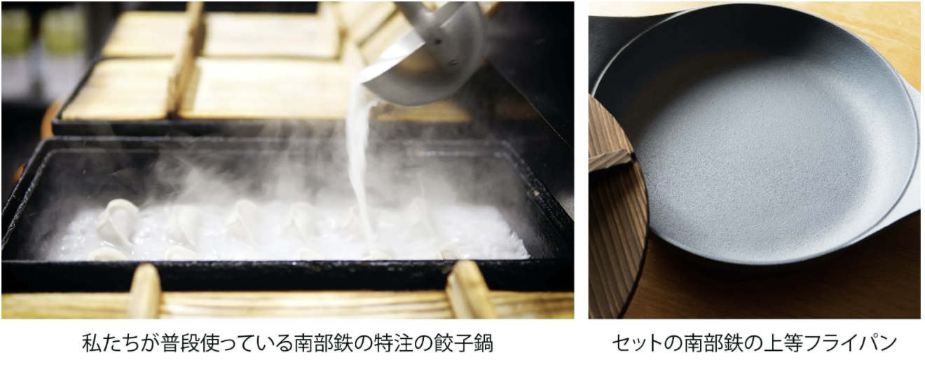 餃子屋本舗では南部鉄器メーカーの及源鋳造(嘉永五年創業)に特注した鉄鍋で餃子をパリパリの羽根つきに焼き上げています。今回は特別に私が特注した餃子鍋と同じ仕様のフライパンセットをご用意しました。