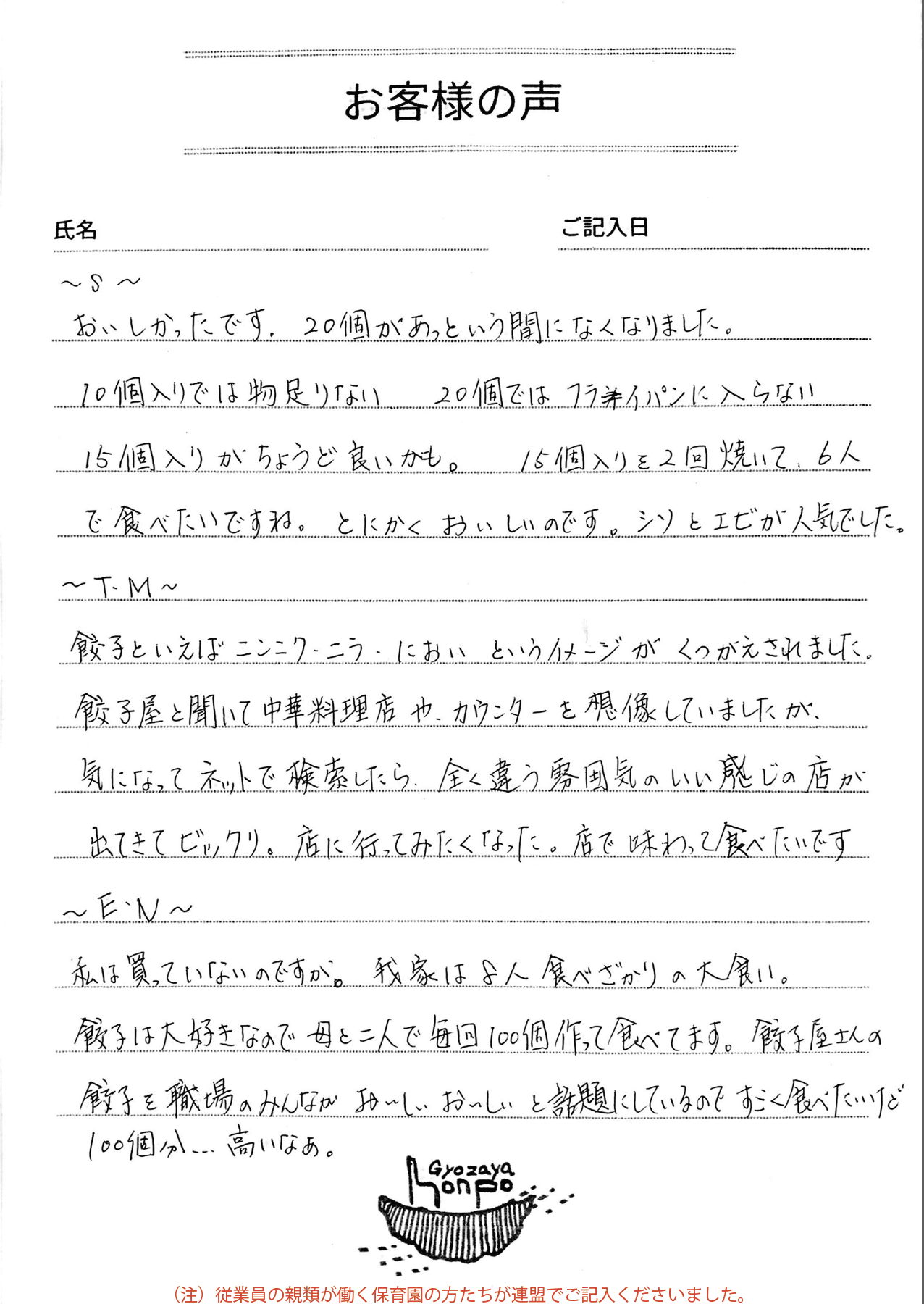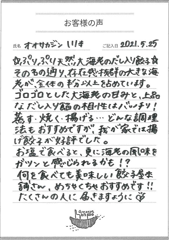 餃子屋本舗は 2021年 2月にクラウドファンディングに初挑戦し、目標金額の 50万円を大きく上回り108万円( 217%)を達成しました。その際に、味の感想をいただきましたので、一部ご紹介いたします。