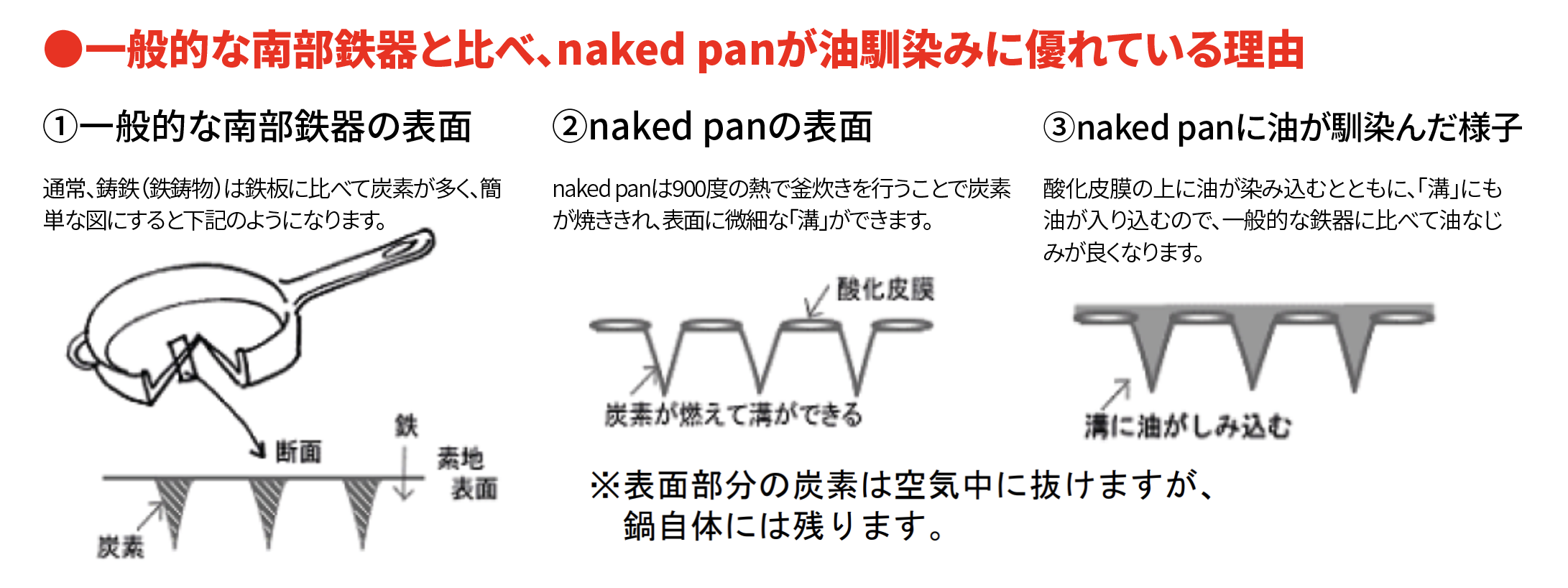 通常の鋳物フライパンには表面に錆止めの塗料が施されています。しかし、このnaked panはフライパンを 900度の熱で焼き込むことで強力な酸化皮膜を形成し、塗料を塗ることなく錆びを防ぎます。そのため、熱が遮られず、表面温度を高く保つことができます。