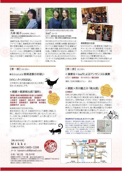そこで、生徒さんにも自分にも元気を!と思い、おととしまで行っていた自分自身の「おはなし演奏会」という、音楽にのせて朗読をするコンサートと、生徒さんの発表会を兼ねた朗読会を合わせ、「朗読コンサート」を実施します。