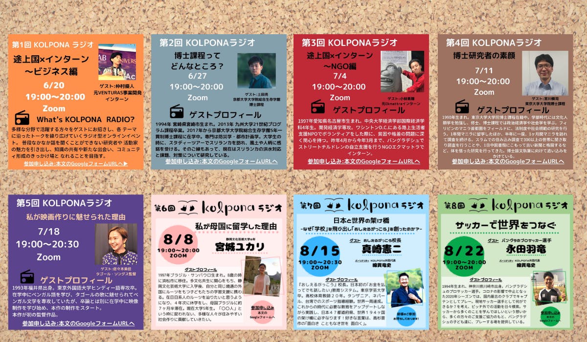 コルポナラジオは、バングラデシュで活躍する日本人や研究者などをゲストにお迎えして毎回多様なトピックについてお話を伺うラジオ型オンラインイベントです。2020年には10回以上の配信を重ね、研究者からバングラデシュの日本人プロサッカー選手まで、多様なゲストをお招きしてきました。回を重ねるごとにコルポナメンバーの司会力、対話力が磨かれていき、講演会や教育活動に必要な力をつける絶好の機会となりました。