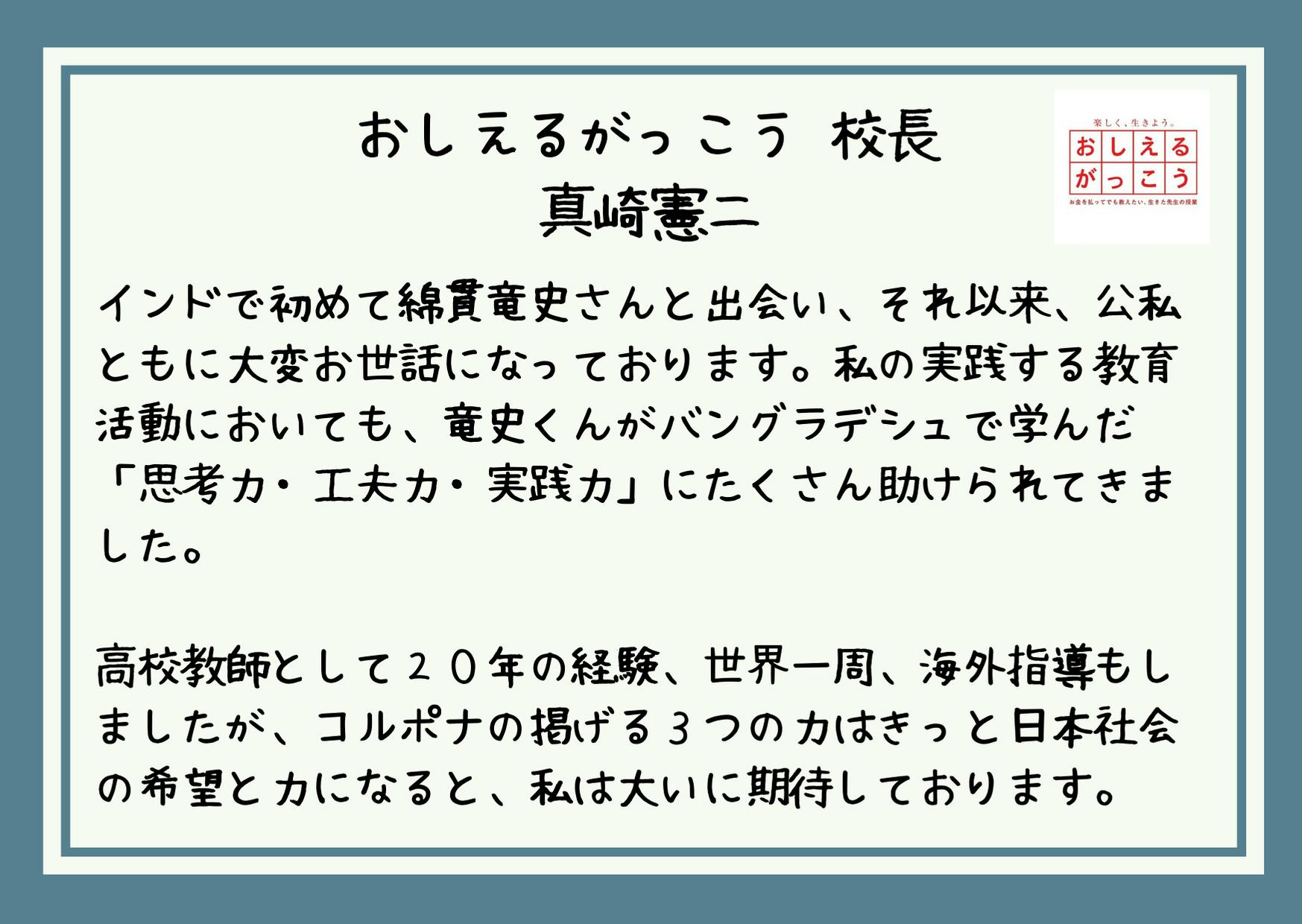 • みなさん!こんばんは。コルポナ共同代表の綿貫です。改めまして、この度は温かいご支援ありがとうございました。本日5月8日。コルポナ主催のオンライン講座 第一回目『工夫のアイデアと罠』がスタートしました!いつもお世話になっている方、お久しぶりな方など、皆さんにお会いできて嬉しかったです。講師を担当したのは、稲川望くん。やるからには、最高の時間をお届けしたいと、かなり準備を整えて臨みました。出せる力を最大限出し切って、最高の授業をお届けできたと思います!今回の授業では、良かれと思ってやったことが、時としてなぜ相手を傷つけてしまうのか?その理由をバングラデシュの実体験をもとに紐解いてくれました。来週、5月15日(土)は第二回講座『制約、工夫、そして多様性』というテーマで私綿貫が授業をさせて頂きます。「多様性」という概念は、よく見聞きするワードですが、実態がよく分からない得体の知れないものだと思うこともよくあります。本当は、一人の人間として相手と向き合ったときに、自然と見出す優しさに自らを委ねればそれで十分なのかもしれません。そんなことを来週は、実際に参加者の皆さんに体験をしてもらいながら感じて頂ければと思います。最後に、本日参加者の皆さんから頂いた感想の一部をシェアして終わりにしようと思います! もっと見る