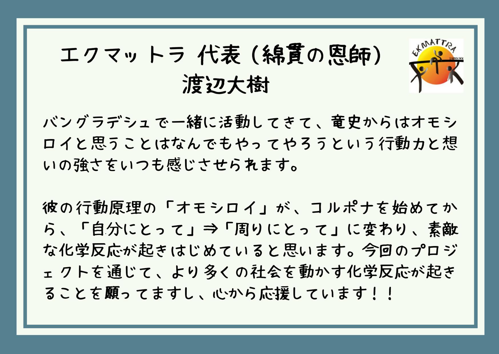 はじめまして。コルポナ共同代表の綿貫竜史です。大学院の博士課程でバングラデシュの地域研究をしながら、縁あって出会った仲間たちとともにバングラデシュでの活動もしています。