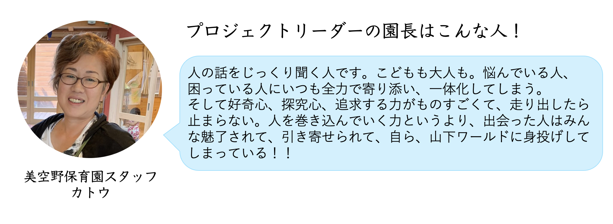 2023/02/10 12:54大変お世話になります。美空野保育園園長の山下です。前回は多くのご支援をありがとうございました。実は今、またプロジェクトを立ち上げさせていただきました。森はさまざまな『生きる』を教えてくれます。こどもたちに遊べる森を残していきたいです。誰もが心地よい場を!夢をいっしょに!まだまだわたしたちがチカラが及ばす…伴走なかまになってくださると嬉しいです!プロジェクトページはこちら!美空野保育園園長 山下佳子 もっと見る