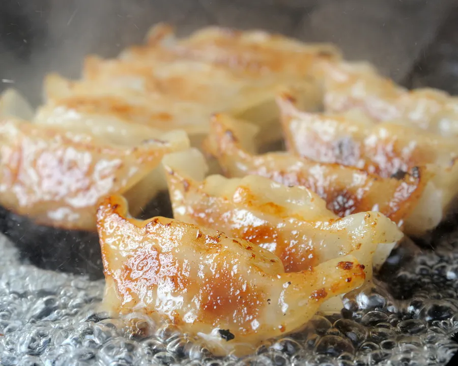 ひき肉、キャベツ、ニラの餡に、ニンニクが効いたパンチのある餃子です。