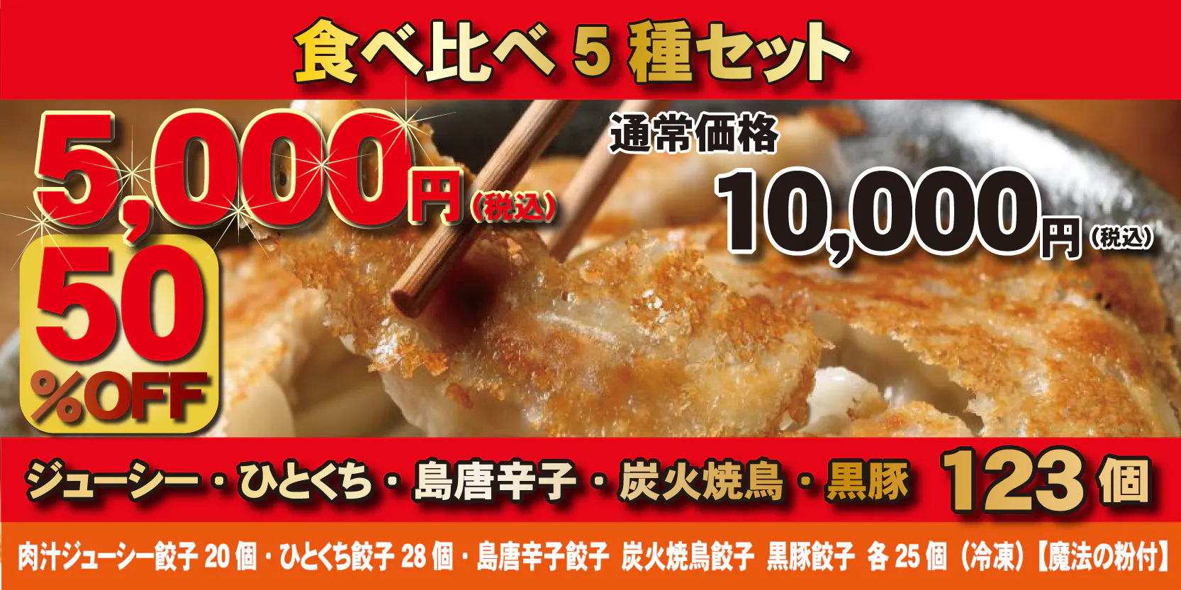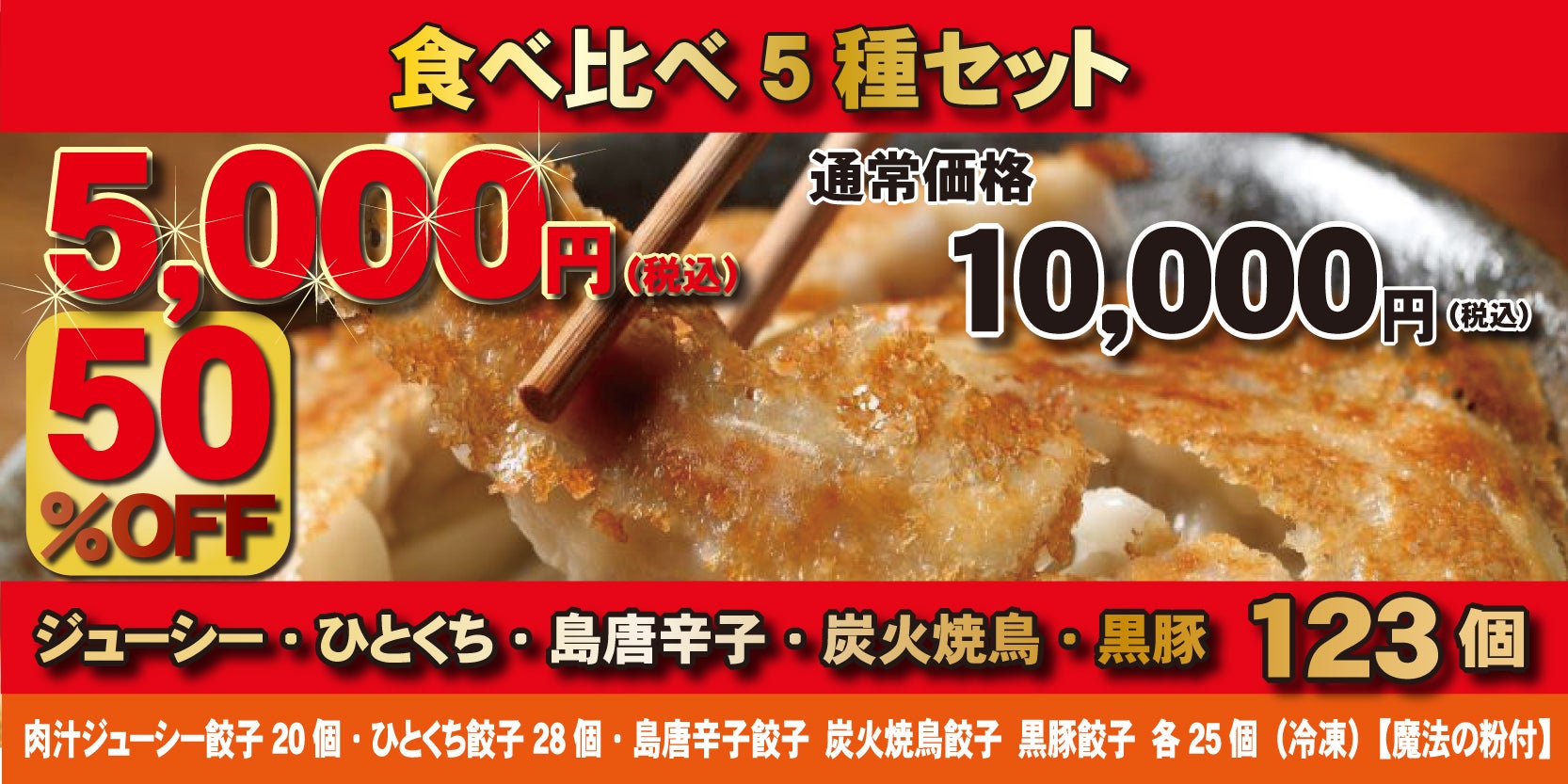 ■リターン①食べ比べ全種セット(ジューシー、ひとくち、島唐辛子、炭火焼鳥、黒豚)冷凍 123個入5,000円(通常価格10,000円円、50%OFF) (価格は消費税、送料込み)