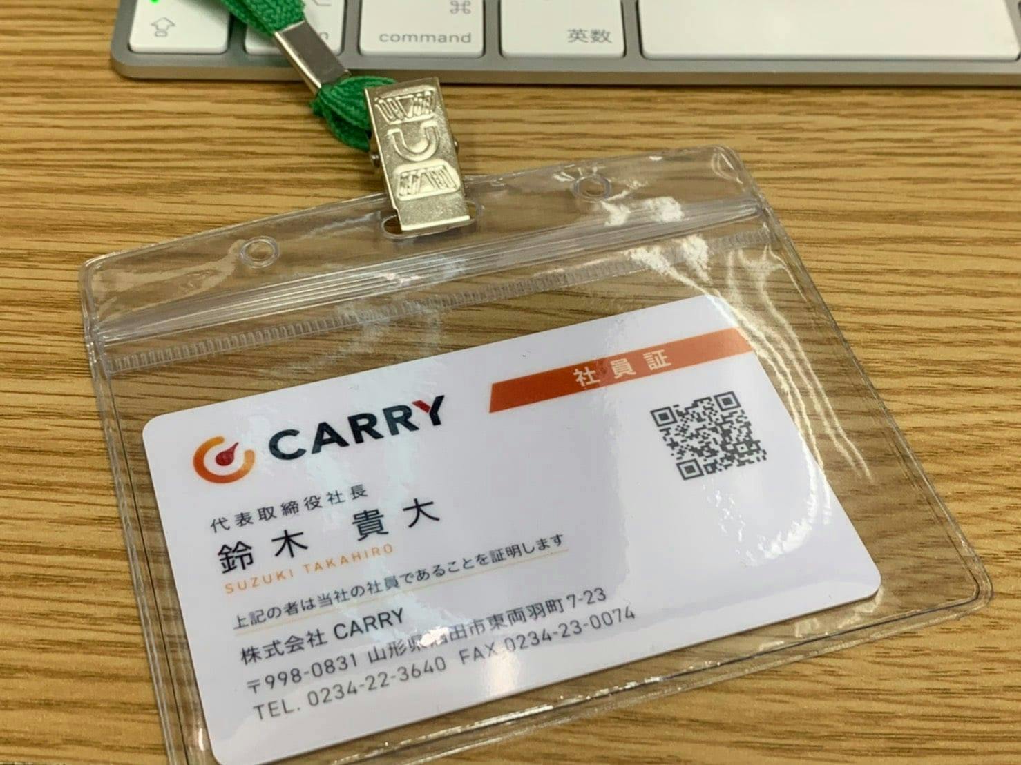この社員証と勤怠管理ICカードがセットになっていて出退勤を入力できるようにしました。