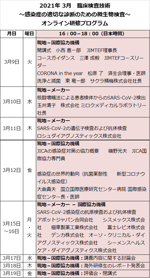 これらの課題解決を視野にこれまでの研修内容をさらに改善し、PCR検査法をはじめとする遺伝子検査法、抗原検査法、抗体検査法など一層充実した研修コースを本年3月から実施しています。