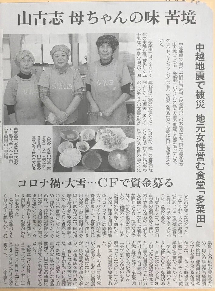 山古志も春の気配が濃くなってきました。山菜のシーズンはすぐそこです。多くの皆様に山古志の味、食文化を知っていただけるよう、多菜田をなんとか守れるよう、プロジェクトの更なる発信をして参ります。