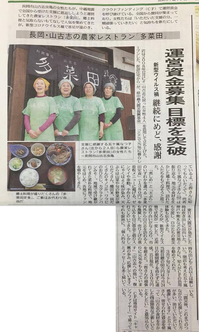 ありがたいことに、クラウドファンディングの取り組みを新潟日報様から記事にしていただきました。掲載いただいたお陰で、昨日はお越し下さるお客様が多かったように思います。本当にありがとうございます。