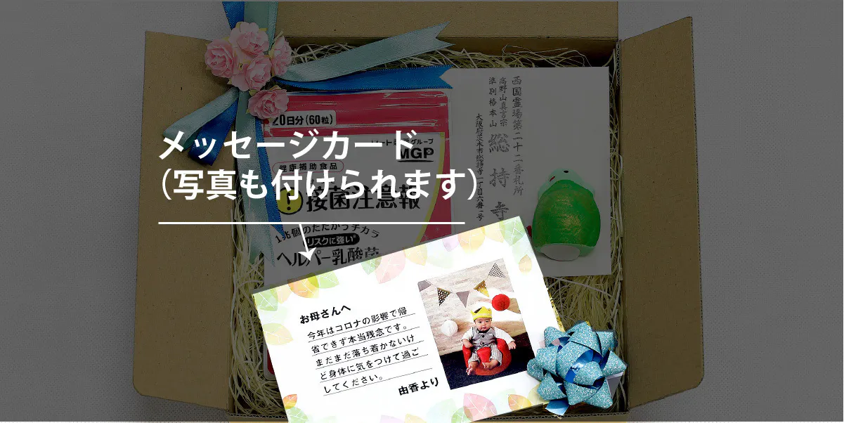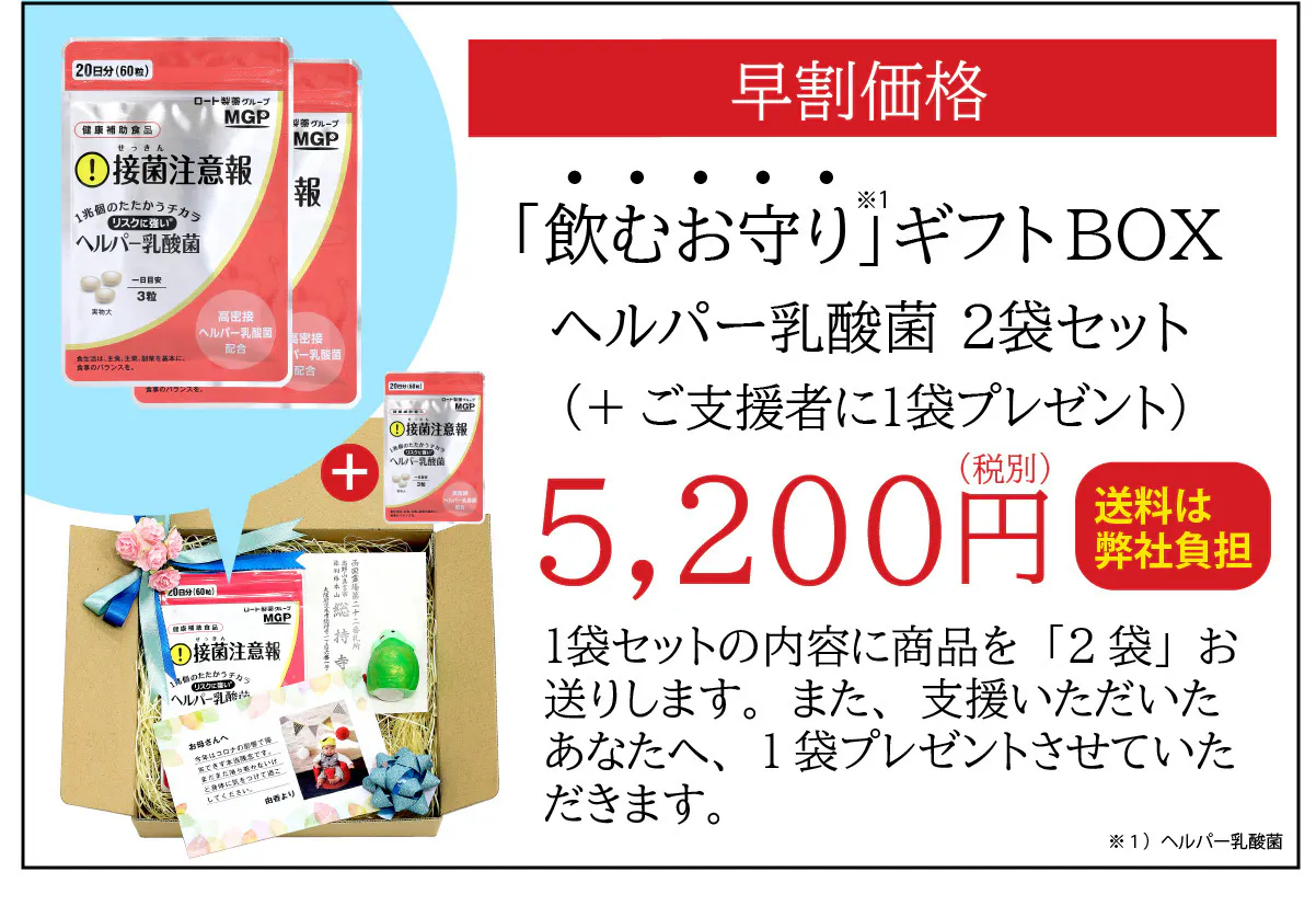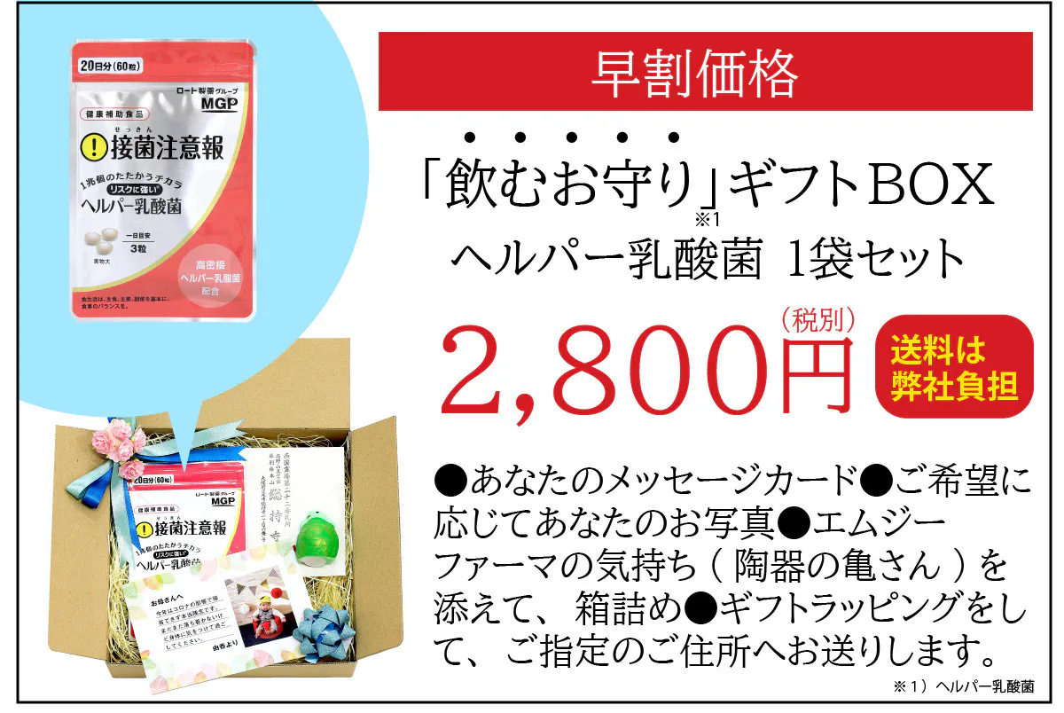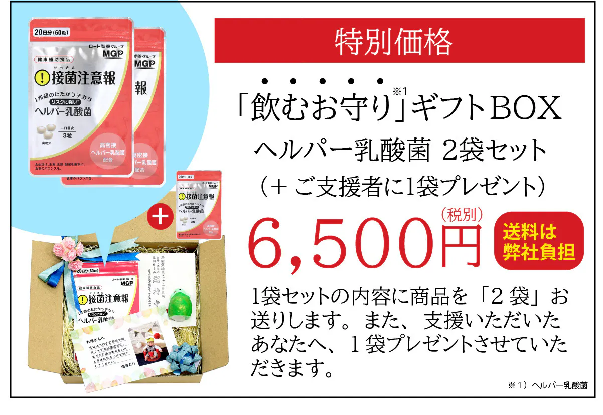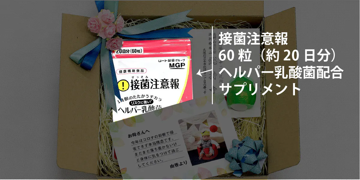 守りたい気持ちを込めて、大切なあの人を守る製品を、私たちが心を込めてお届けすることができないだろうか。そう思い、まるで「飲むお守り」、私たちが開発した「ヘルパー乳酸菌」のサプリメントを特別パッケージの「ギフト」にしようと考えたのです。