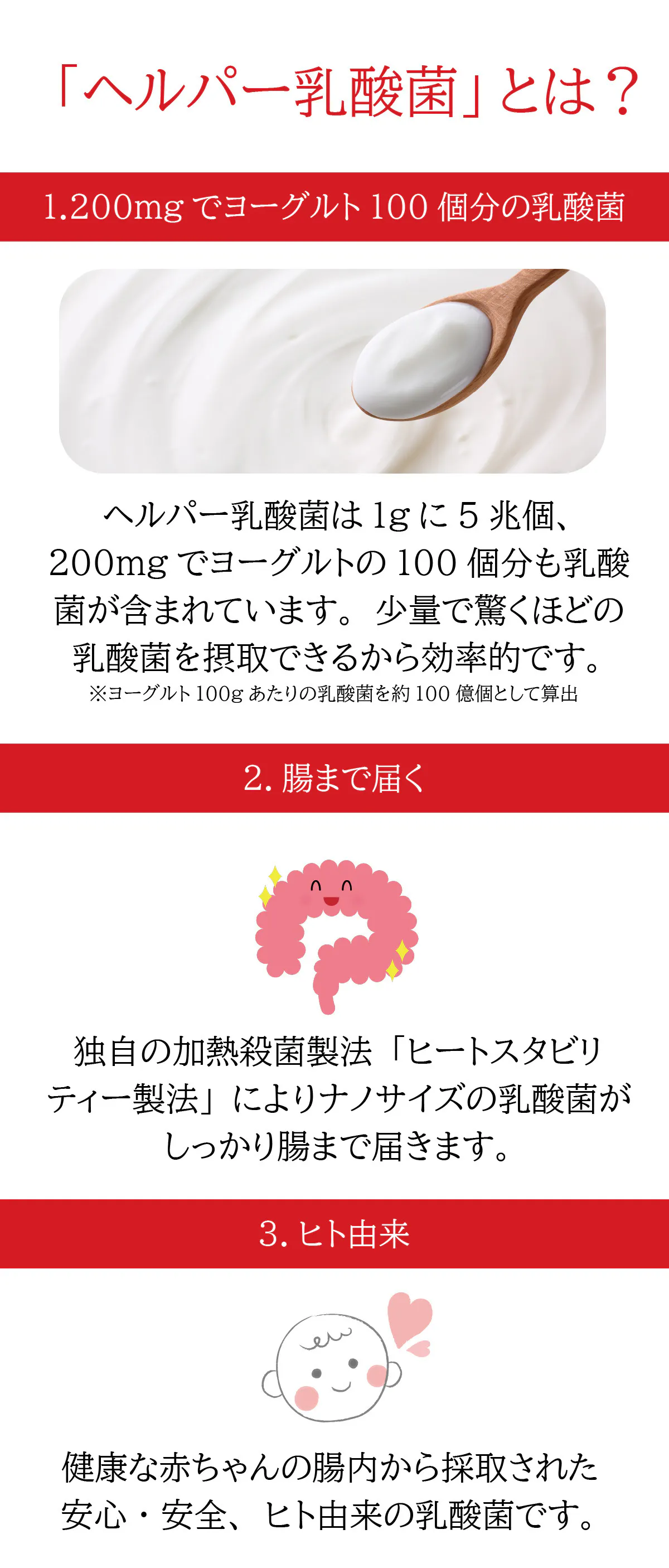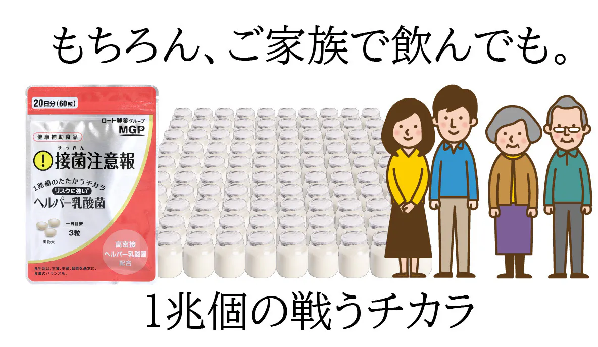 私たちエムジーファーマが開発したサプリメント「接菌注意報」は、1日3粒で1兆個のたたかうチカラ、独自開発の「ヘルパー乳酸菌」を配合。1日にヨーグルト100個分の乳酸菌を摂取することができます。