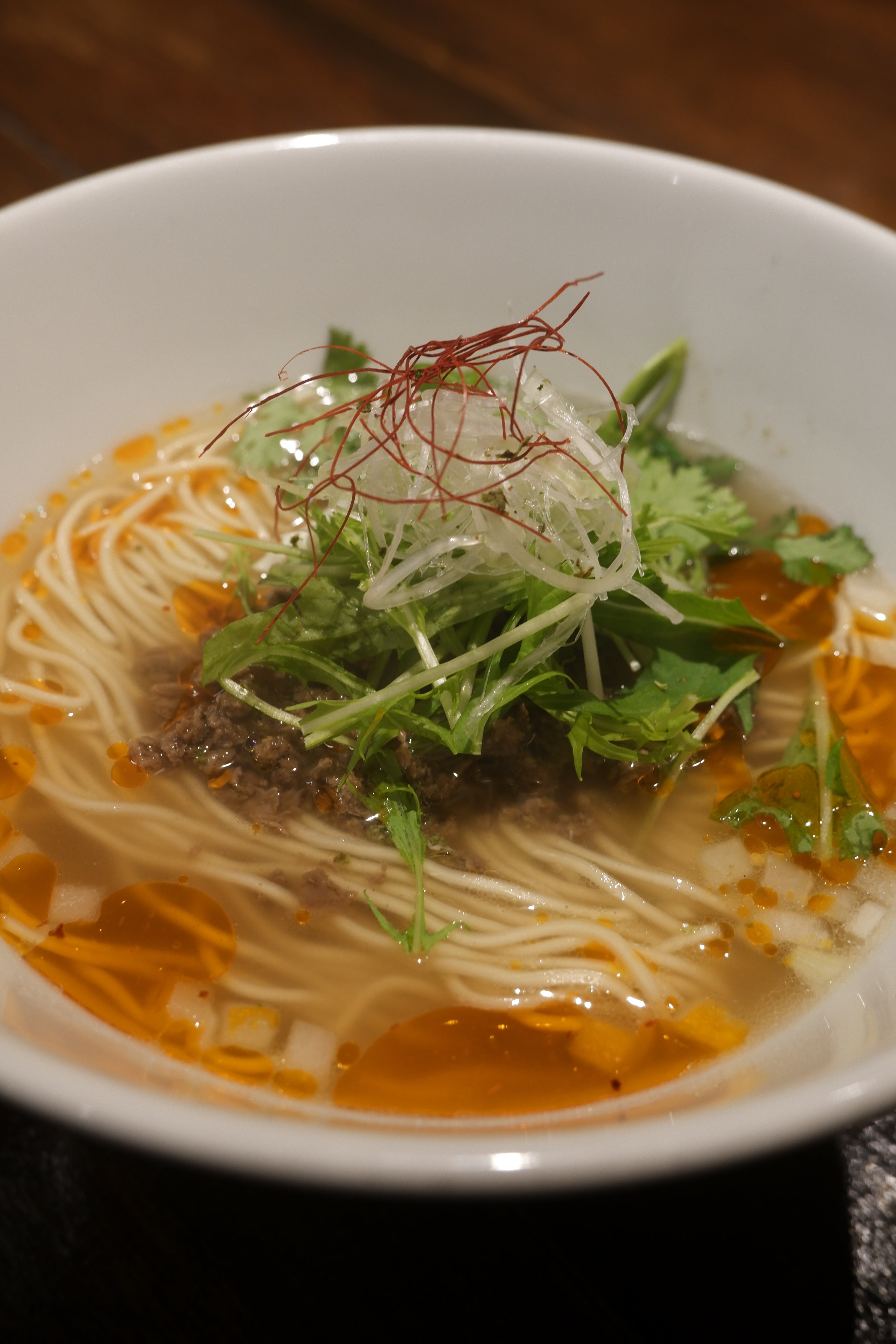 透き通ったスープは牛骨ラーメンを彷彿とさせる優しい味わい 鹿肉ミンチを上に添えています