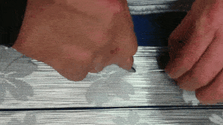 織り込んだ針金のうち、二段目の針金に乗った経糸は、織りあがった際に一本一本、カッターで切っていき、そこから二段目の針金を取り除きます。一段目の針金は、一本一本、生地から引き抜きます。