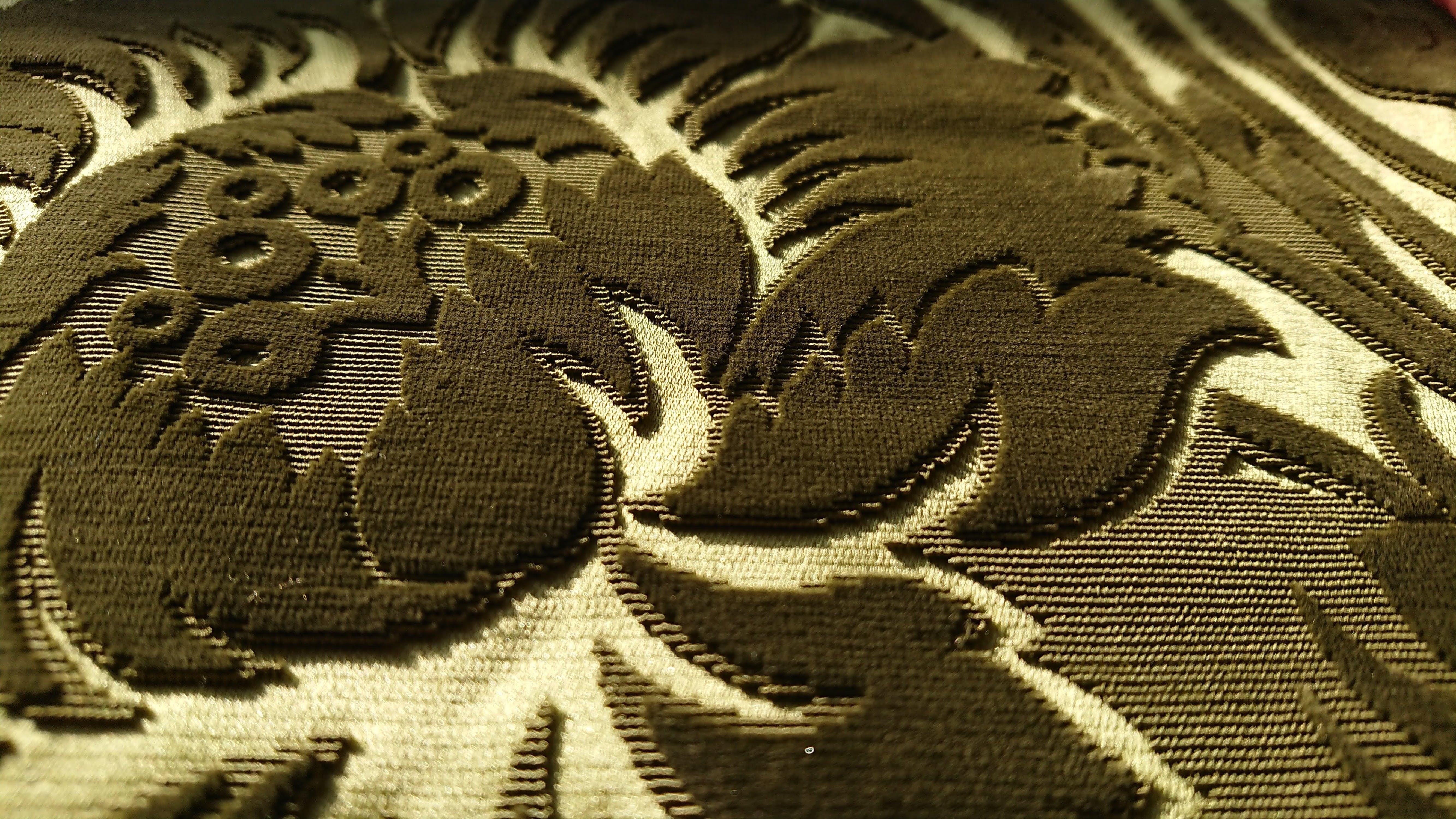 多く流通しているビロードの製品と違い、私の織り上げるビロードはパイルとカットパイルを組み合わせて紋様を織り出しており、これは二段織紋ビロードと呼ばれています。