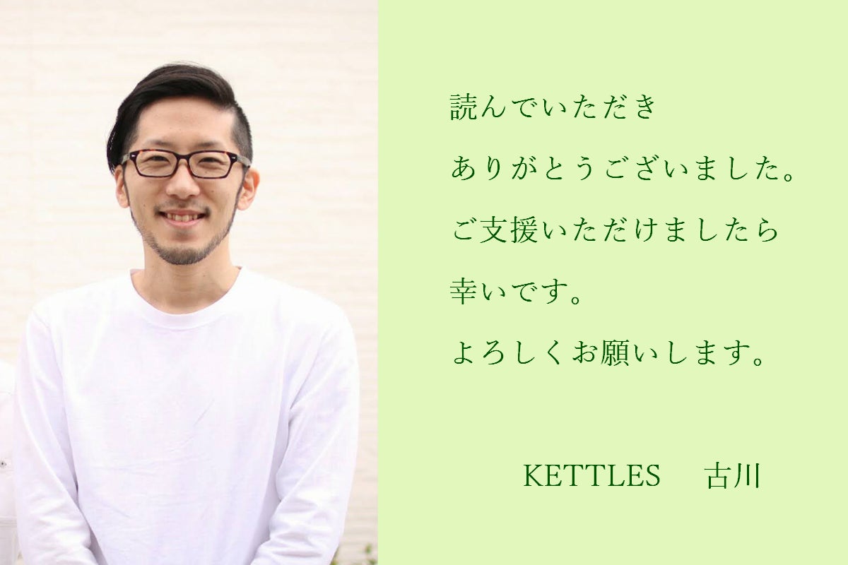 そして、ご支援いただいた方、拡散していただいた方、ご協力いただいた皆様、本当にありがとうございます。今後ともKETTLESをどうぞよろしくお願いします。