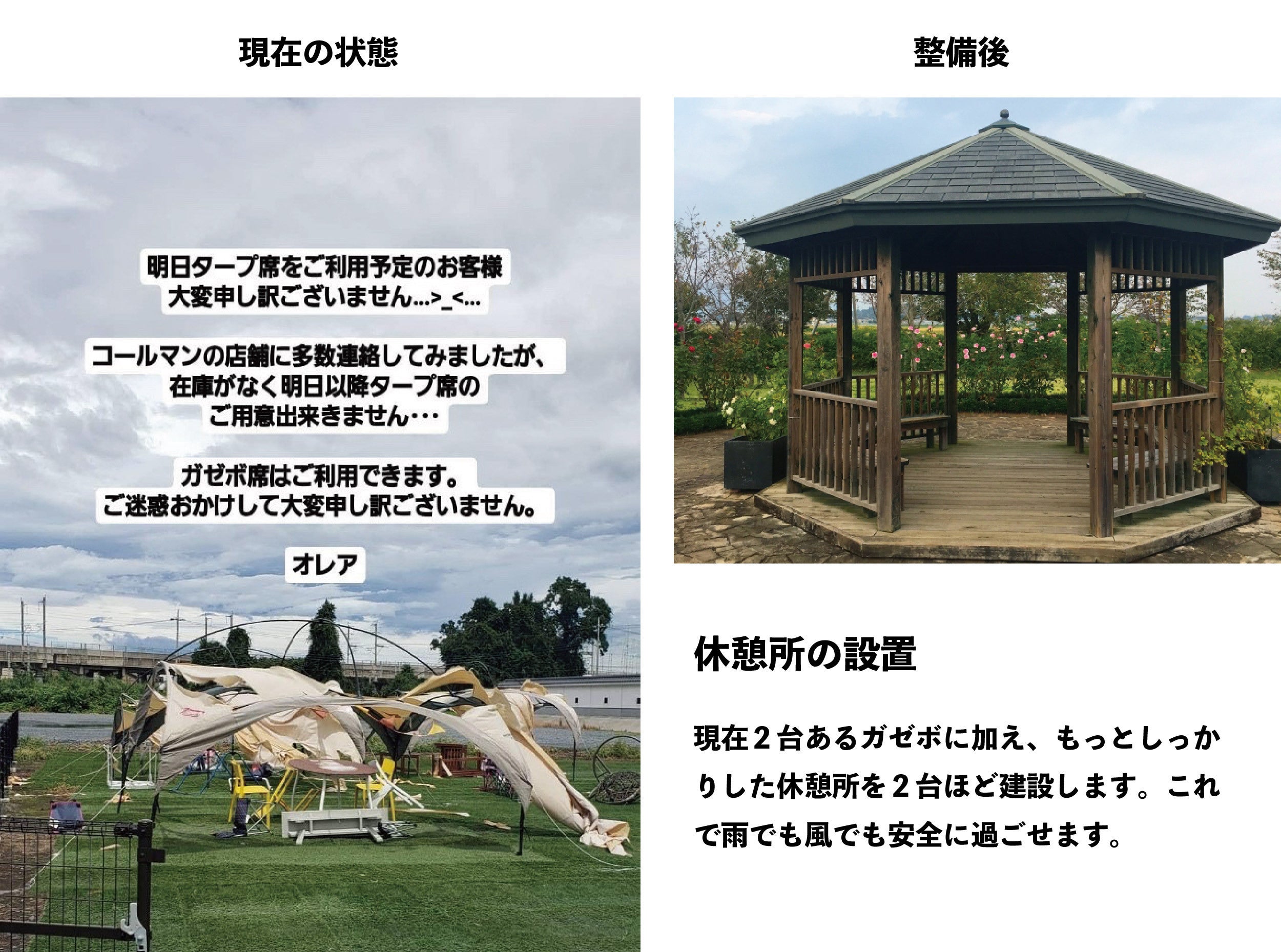 今あるテントでは強風には耐えられません。風が吹くたびに、しまったり、治したり。しっかりした休憩所があれば、強風でも安心。また、コロナのため中止していたレッスンも行えるよう、オープンエアーのイベントスペースとしても活用します。