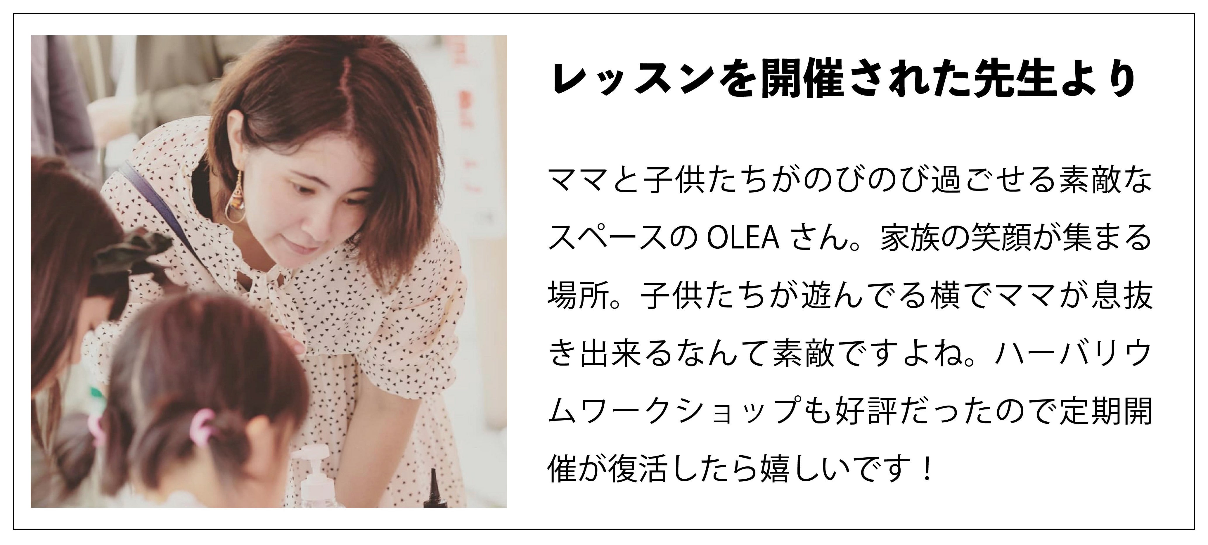 お子さんが小さく、会社に戻るのは難しいと諦めているお母さんはたくさんいますよね。そこでできたのが、月に一回ほどのペースで開催しているOLEA シェアマーケット。子育て中のお母さんたちがお家で作った雑貨やアクセサリーなどで出店。もちろん子連れ出店大歓迎。子供たちもOLEAで遊べるから安心。こちらのイベントも大好評をいただき、毎回約500名前後の来場者数!!出店者の方にも喜んでいただき、毎回出店枠も満員です。